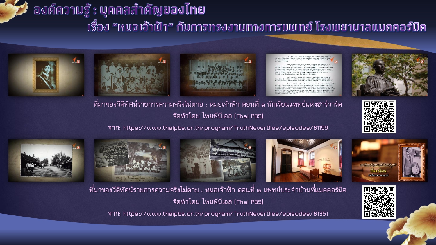 ไทยพีบีเอส (Thai PBS). รายการความจริงไม่ตาย : หมอเจ้าฟ้า ตอนที่ ๑ นักเรียนแพทย์แห่งฮาร์วาร์ด. [ออนไลน์]. สืบค้นเมื่อ ๑๒ กันยายน ๒๕๖๗,