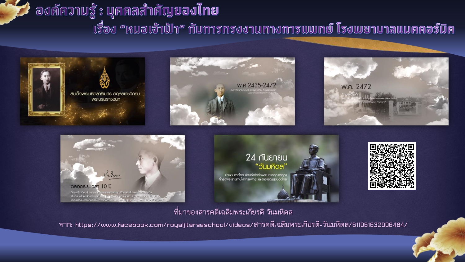 จาก: https://www.facebook.com/royaljitarsaschool/videos/สารคดีเฉลิมพระเกียรติ-วันมหิดล/611061632906484/, ๒๕๖๓.