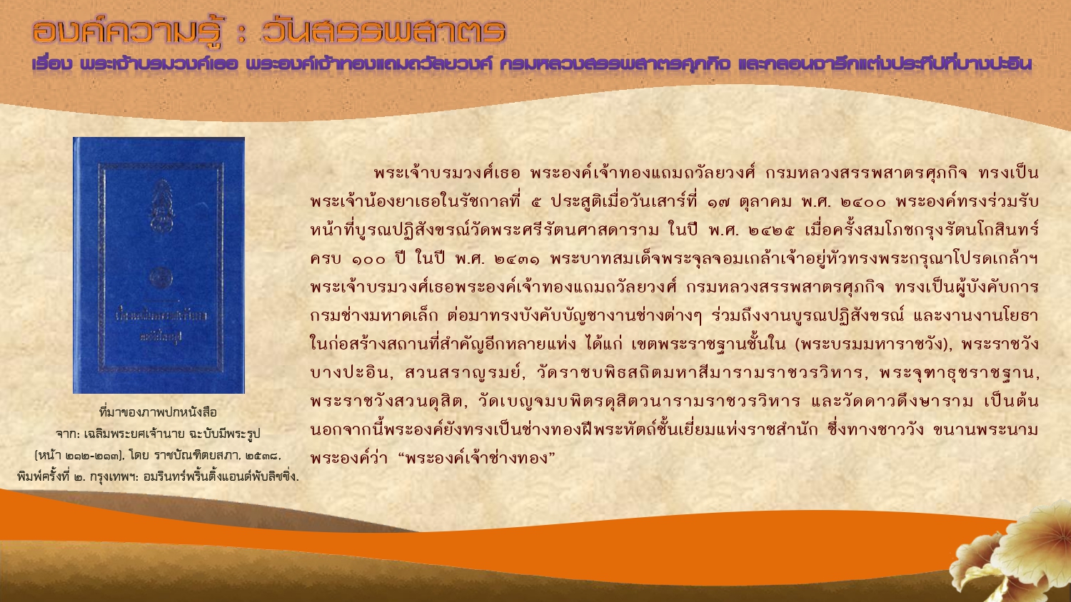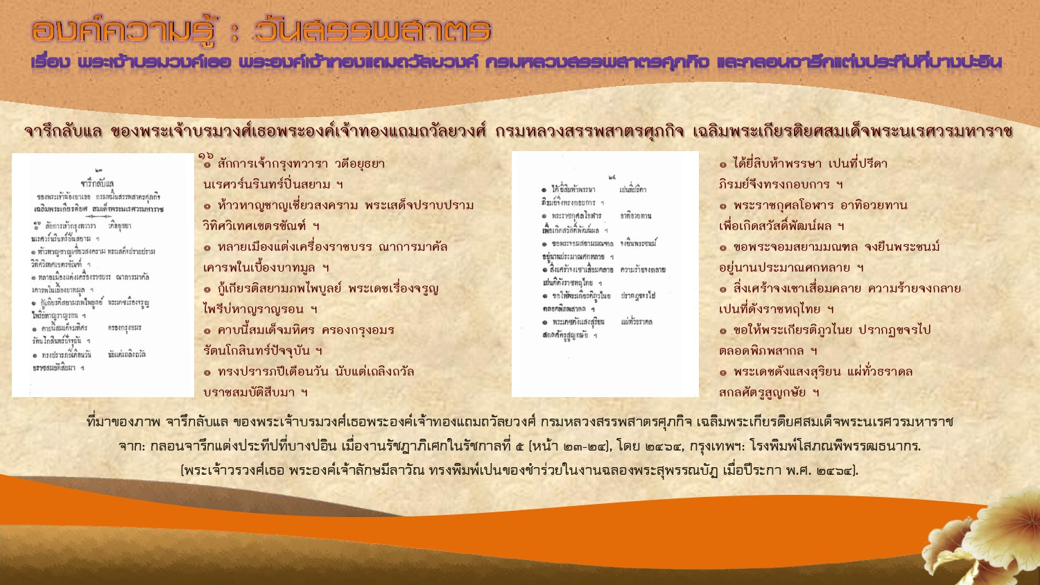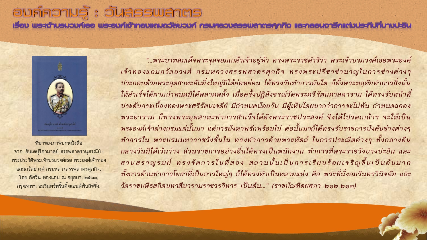 Thairoyalfamily. พระเจ้าบรมวงศ์เธอ พระองค์เจ้าทองแถมถวัลยวงศ์ กรมหลวงสรรพสาตรศุภกิจ. [ออนไลน์]. สืบค้นเมื่อ ๑๖ ตุลาคม ๒๕๖๗,