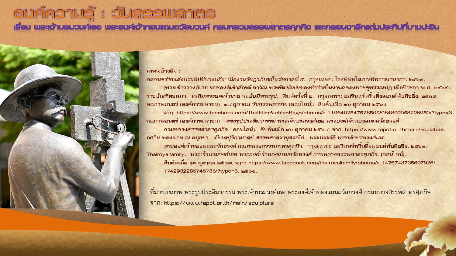 หอภาพยนตร์ (องค์การมหาชน). พระรูปประติมากรรม พระเจ้าบรมวงศ์เธอ พระองค์เจ้าทองแถมถวัลยวงศ์ กรมหลวงสรรพสาตรศุภกิจ. [ออนไลน์].