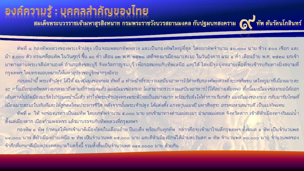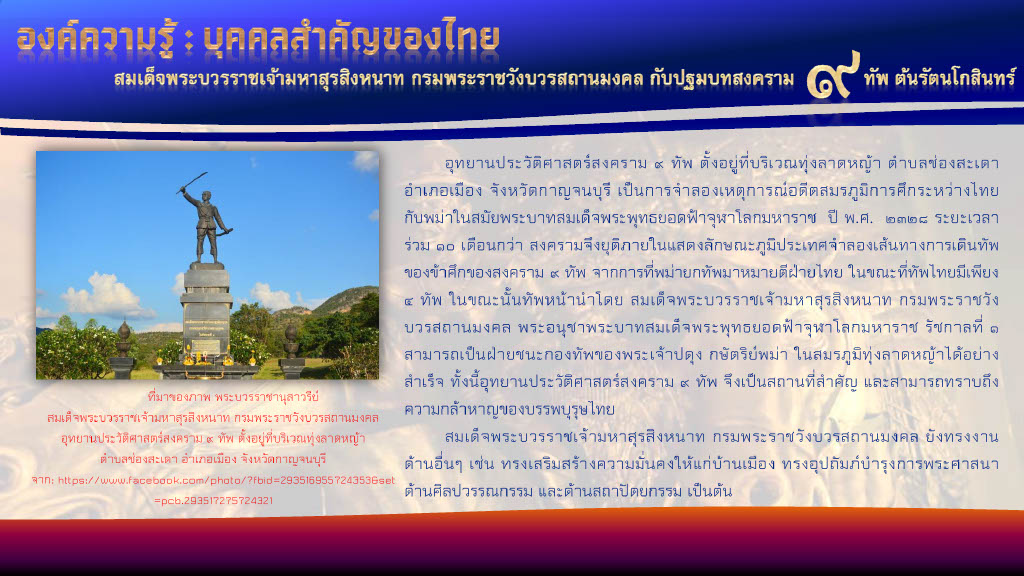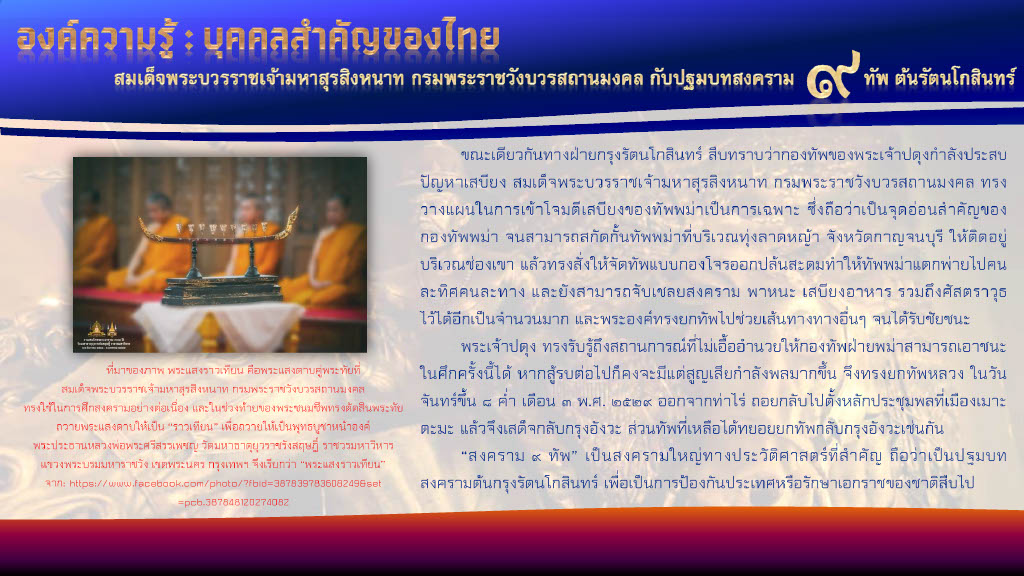 “สงคราม ๙ ทัพ” เป็นสงครามใหญ่ทางประวัติศาสตร์ที่สำคัญ ถือว่าเป็นปฐมบทสงครามต้นกรุงรัตนโกสินทร์ เพื่อเป็นการป้องกันประเทศหรือรักษาเอกราชของชาติสืบไป
