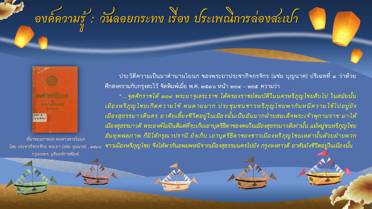 เพราะเหตุนี้ ชนทั้งหลายใดที่ได้กลับคืนมายังเมืองหริภุญไชยนี้แล้ว เมื่อระลึกถึงหมู่ญาติอันยังอยู่เมืองหงสาวดี ครั้นถึงกำหนดปีเดือน ย่อมแต่งเครื่องสักการะไปบูชาโดยทางน้ำ เรียกว่า ลอยโขมด (คือลอยไฟ) จึงเป็นประเพณีลอยประทีป สืบมา...”