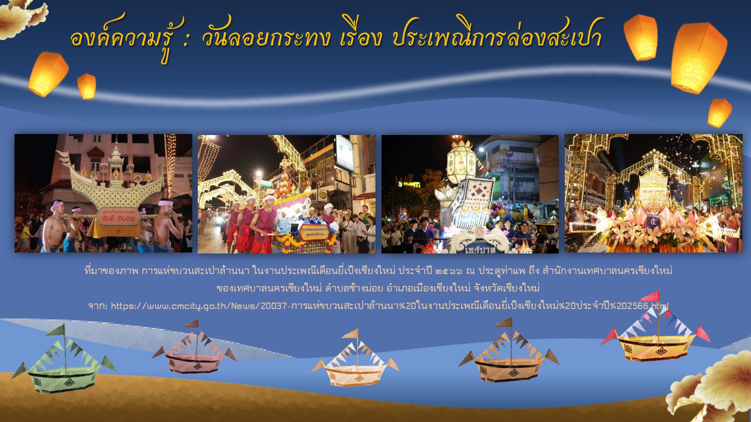 เทศบาลนครเชียงใหม่. การแห่ขบวนสะเปาล้านนา ในงานประเพณีเดือนยี่เป็งเชียงใหม่ ประจำปี ๒๕๖๖. [ออนไลน์]. สืบค้นเมื่อ ๑๓ พฤศจิกายน ๒๕๖๗,