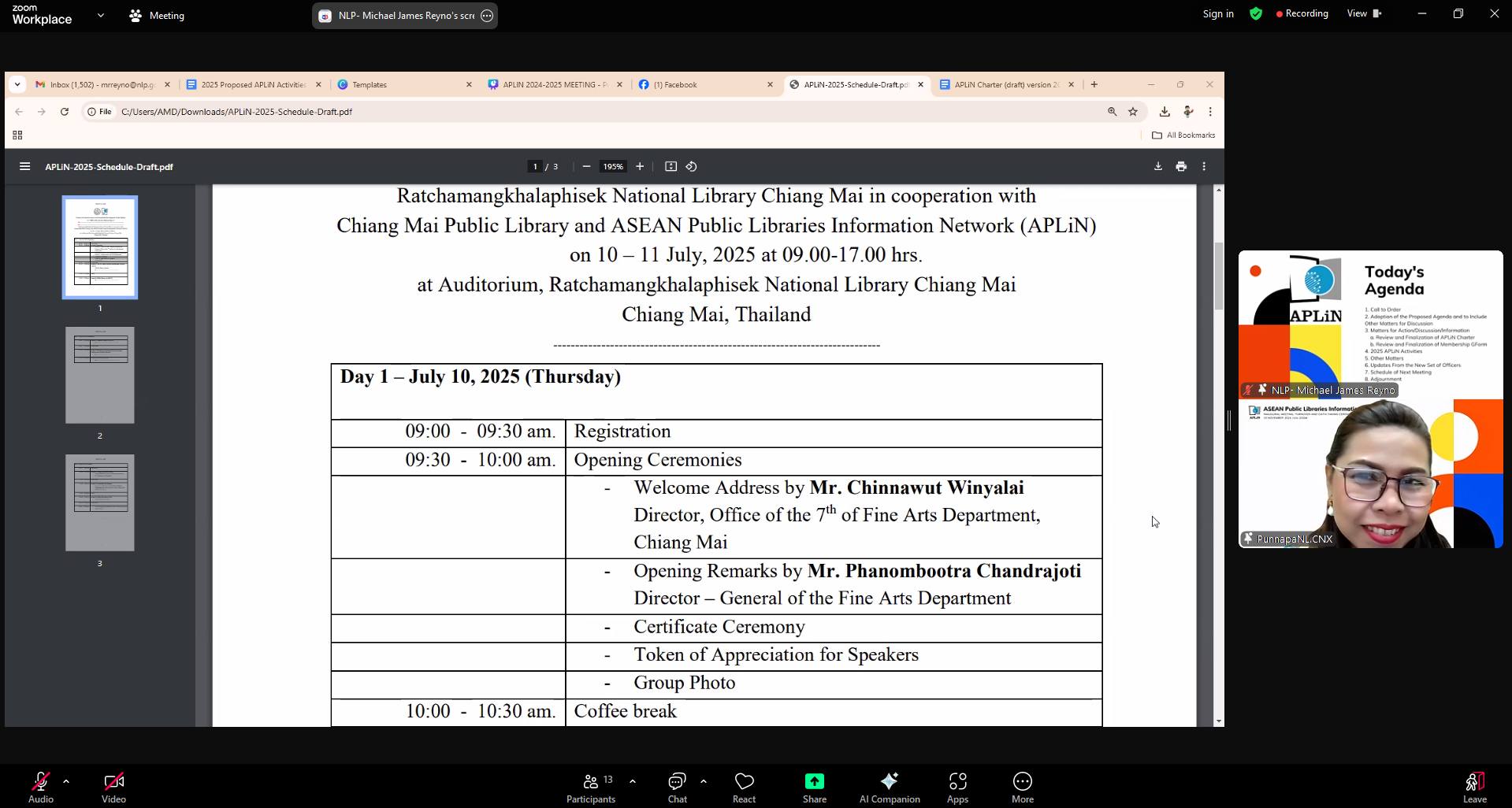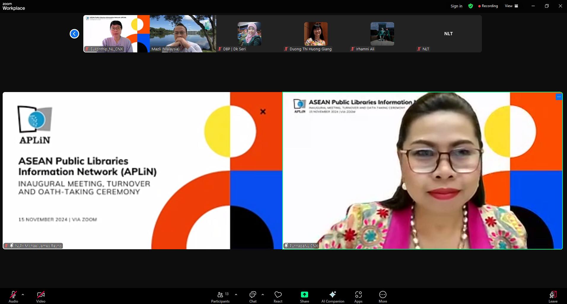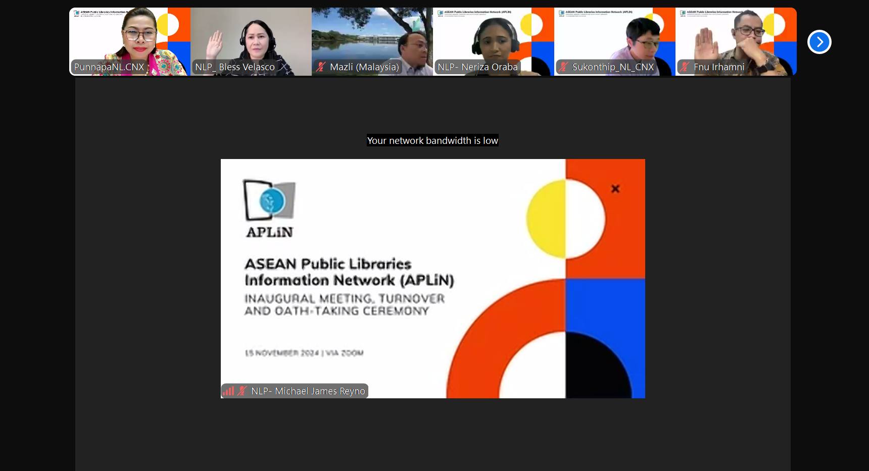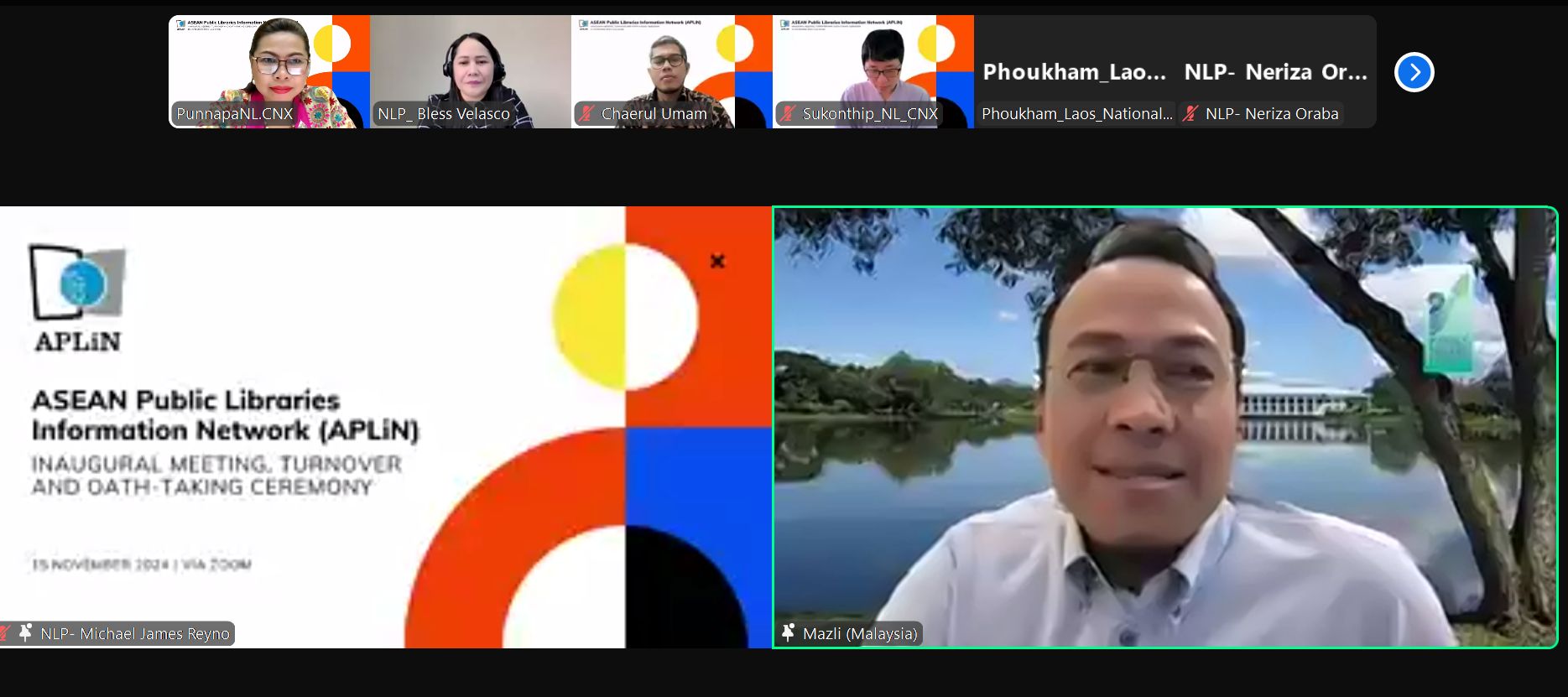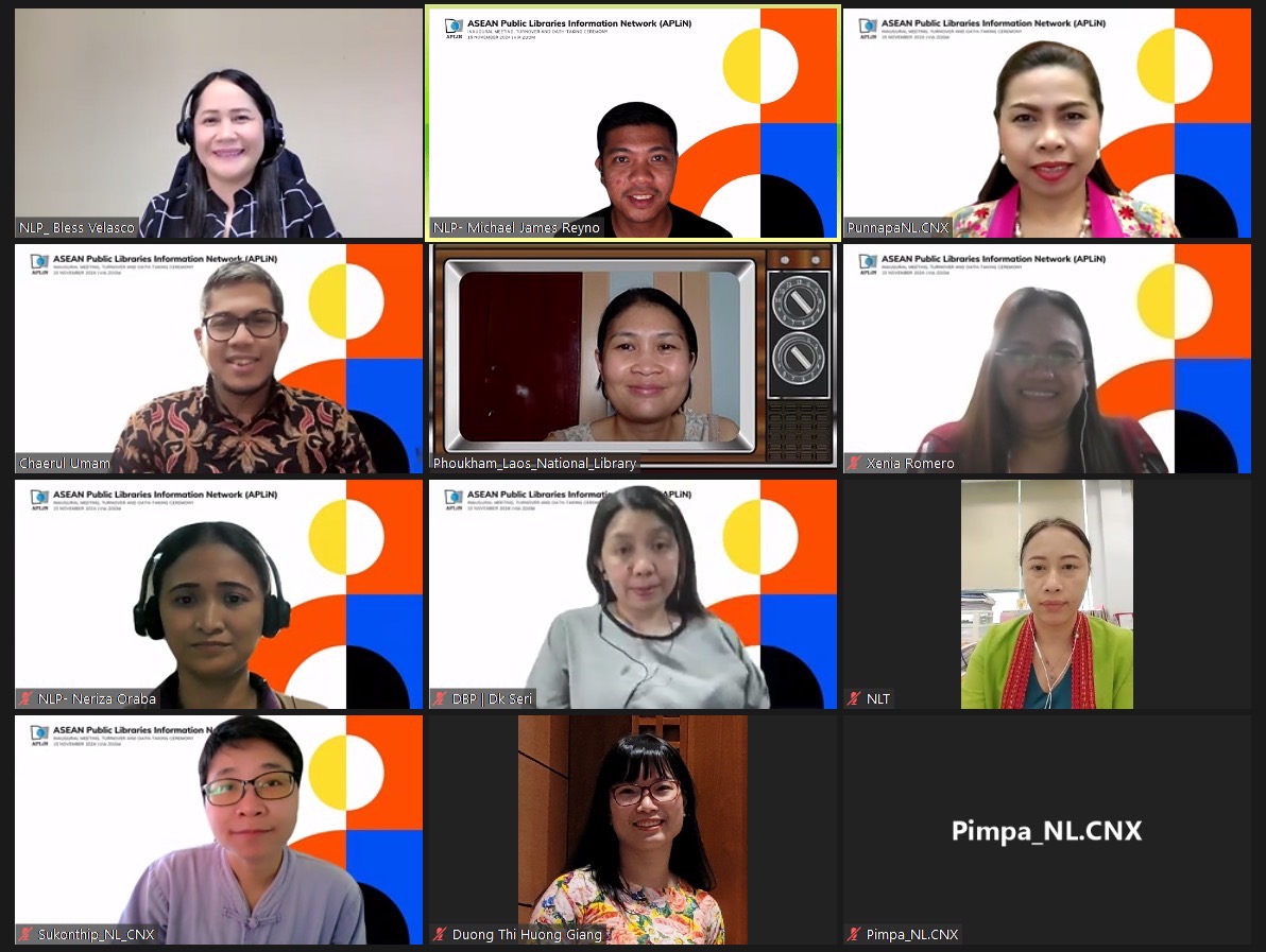 วันศุกร์ที่ ๑๕ พฤศจิกายน ๒๕๖๗ นางสาวปุณณภา สุขสาคร ผู้อำนวยการหอสมุดแห่งชาติรัชมังคลาภิเษก เชียงใหม่ พร้อมด้วยนางสาวสุคนธ์ทิพย์ จันทะลุน และนางสาวพิมพา สุธัญญาวัชชัย บรรณารักษ์ชำนาญการ เข้าร่วมประชุม Asean Public Libraries Information Network (APLiN) : Inaugural meeting, turnover and oath-talking ceremony ผ่านโปรแกรมออนไลน์ Zoom meeting