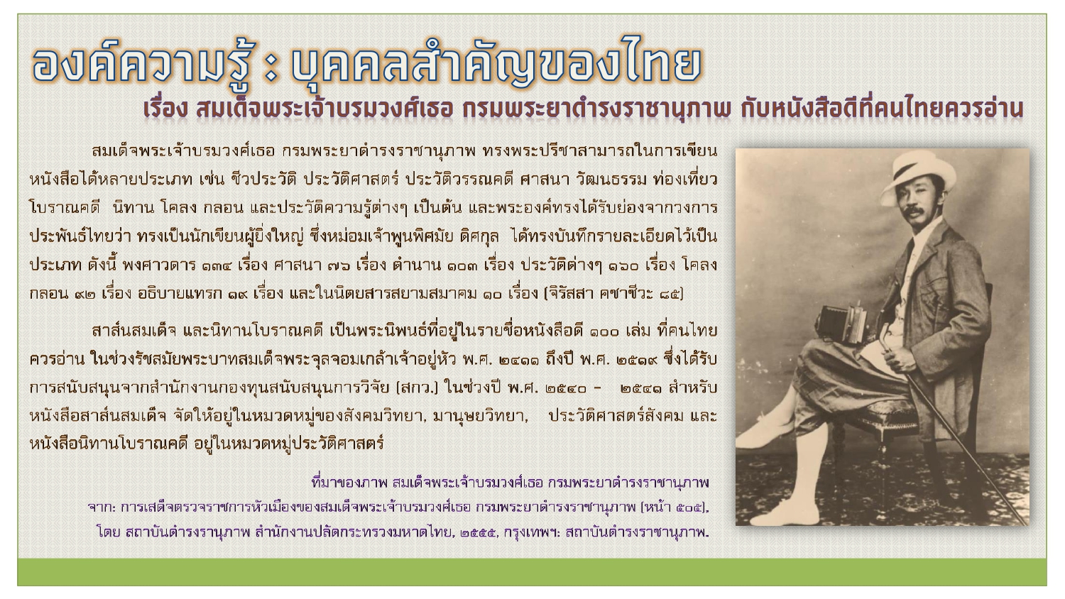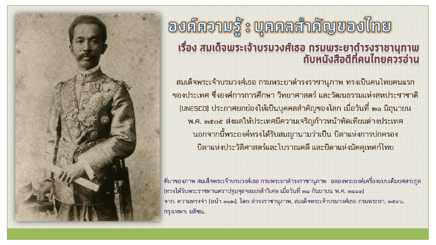 สมเด็จพระเจ้าบรมวงศ์เธอ กรมพระยาดำรงราชานุภาพ ทรงเป็นคนไทยคนแรกของประเทศ ซึ่งองค์การการศึกษา วิทยาศาสตร์ และวัฒนธรรมแห่งสหประชาชาติ (UNESCO) ประกาศยกย่องให้เป็นบุคคลสำคัญของโลก เมื่อวันที่ ๒๑ มิถุนายน พ.ศ. ๒๕๐๕ ส่งผลให้ประเทศมีความเจริญก้าวหน้าทัดเทียมต่างประเทศ นอกจากนี้พระองค์ทรงได้รับสมญานามว่าเป็น บิดาแห่งการปกครอง บิดาแห่งประวัติศาสตร์และโบราณคดี และบิดาแห่งมัคคุเทศก์ไทย