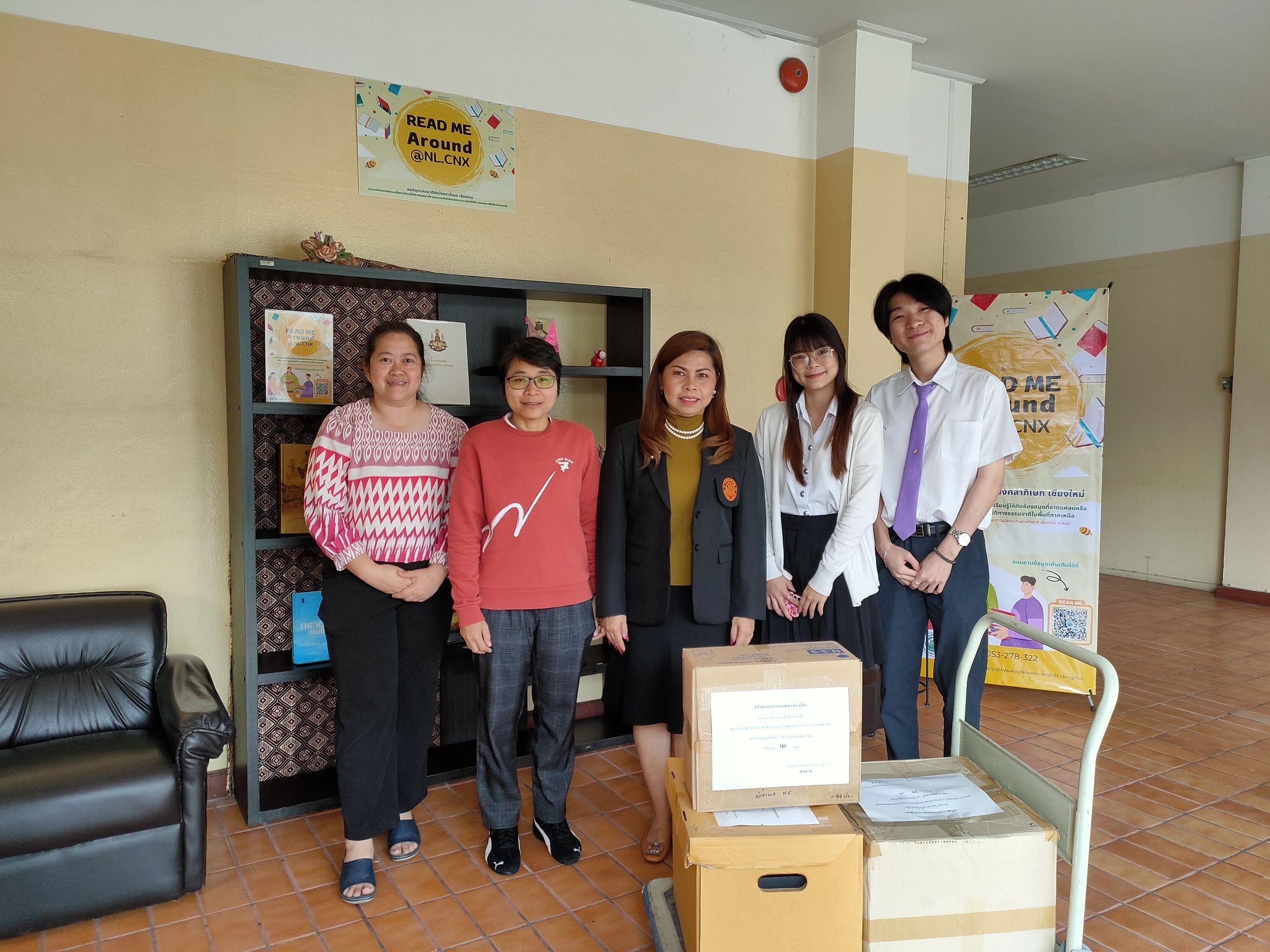 นักศึกษาจากภาควิชาบรรณารักษ์ศาสตร์และสารสนเทศศาสตร์ คณะมนุษยศาสตร์ มหาวิทยาลัยเชียงใหม่ รับมอบหนังสือบริจาคของหอสมุดแห่งชาติรัชมังคลาภิเษก เชียงใหม่