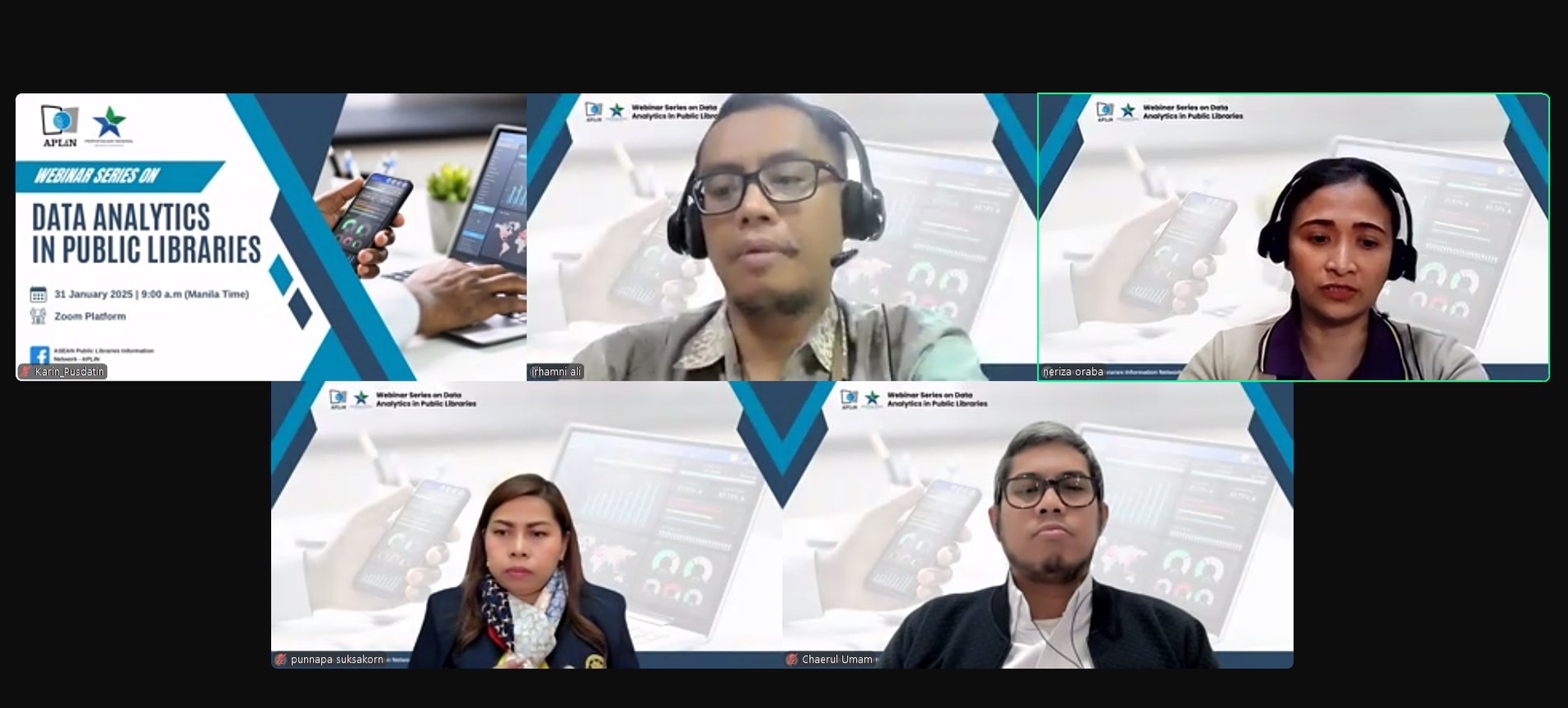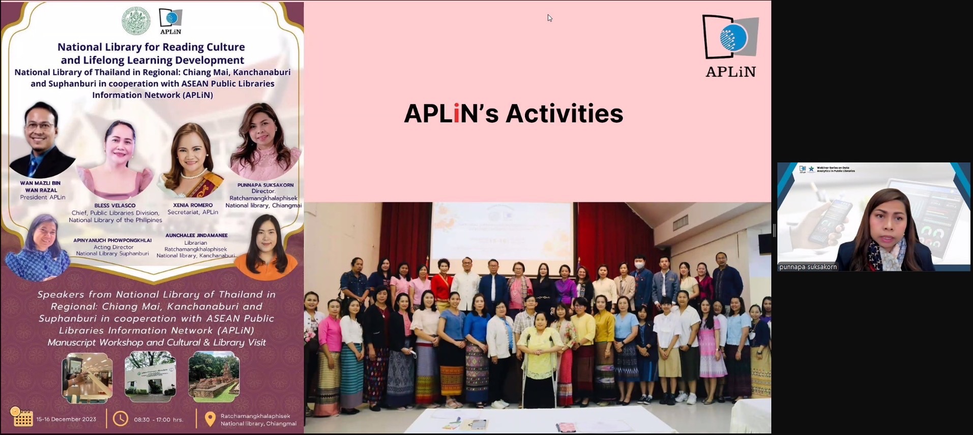 วันศุกร์ที่ ๓๑ มกราคม ๒๕๖๘ เวลา ๐๘.๐๐ น. นางสาวปุณณภา สุขสาคร ผู้อำนวยการหอสมุดแห่งชาติรัชมังคลาภิเษก เชียงใหม่ เข้าร่วมสัมมนาออนไลน์ หัวข้อ “การวิเคราะห์ข้อมูลห้องสมุดประชาชน” จัดโดย เครือข่ายสารสนเทศห้องสมุดประชาชนอาเซียน (APLiN) ร่วมกับหอสมุดแห่งชาติอินโดนีเซีย และได้บรรยาย เรื่อง Introduction to ASEAN Public Library Information Network ผ่านระบบออนไลน์ Zoom Meeting