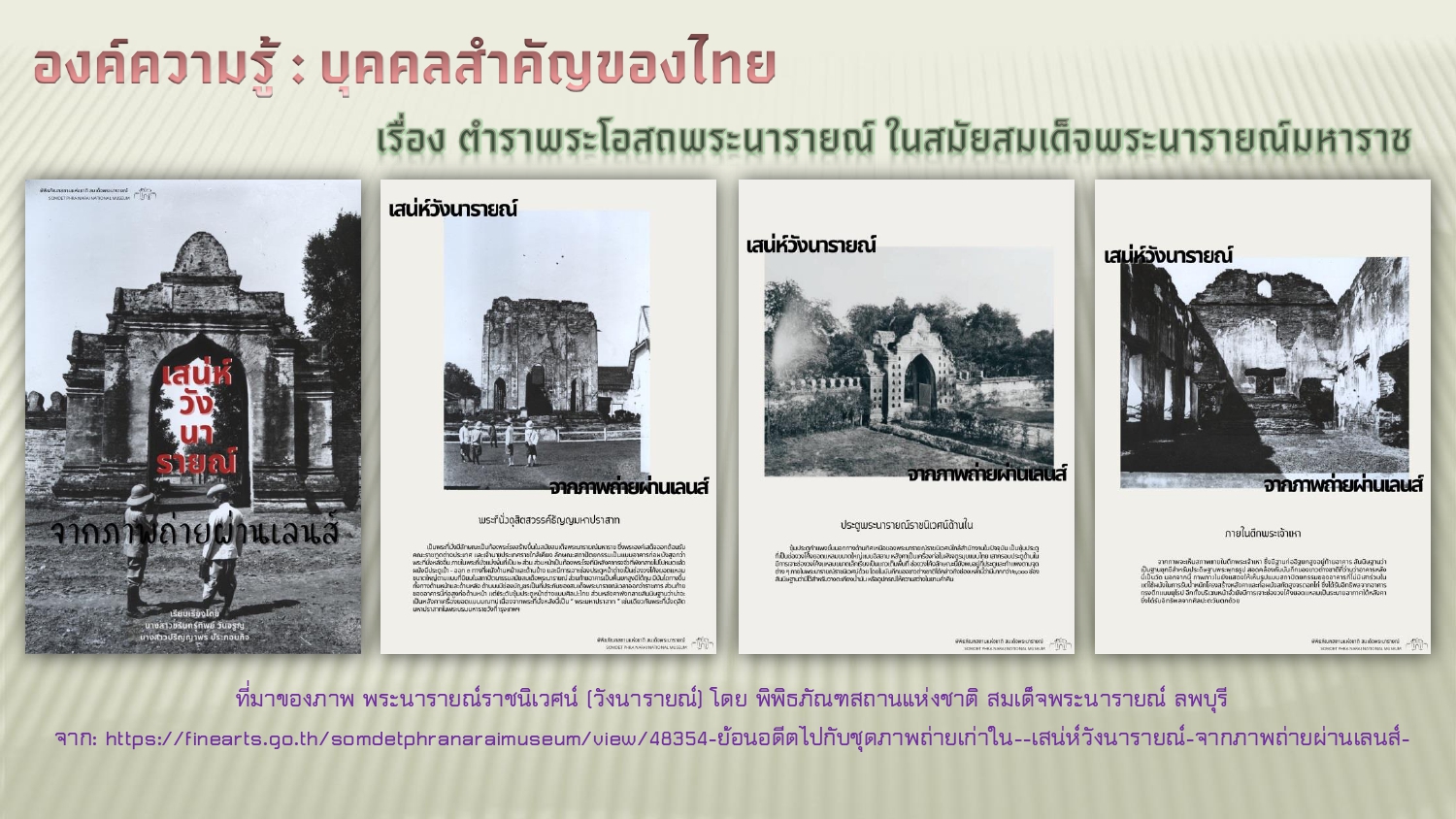 พิพิธภัณฑสถานแห่งชาติ สมเด็จพระนารายณ์ ลพบุรี. ย้อนอดีตไปกับชุดภาพถ่ายเก่าใน “เสน่ห์วังนารายณ์ จากภาพถ่ายผ่านเลนส์”. [ออนไลน์]. สืบค้นเมื่อ ๑ กุมภาพันธ์ ๒๕๖๘,