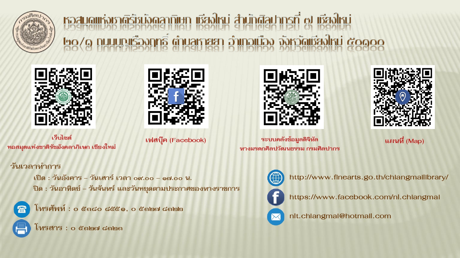 เรียบเรียงโดย : นายธีรบูลย์ มิตรมโนชัย นักวิชาการโสตทัศนศึกษาชำนาญการ หอสมุดแห่งชาติรัชมังคลาภิเษก เชียงใหม่ สำนักศิลปากรที่ ๗ เชียงใหม่ กรมศิลปากร กระทรวงวัฒนธรรม