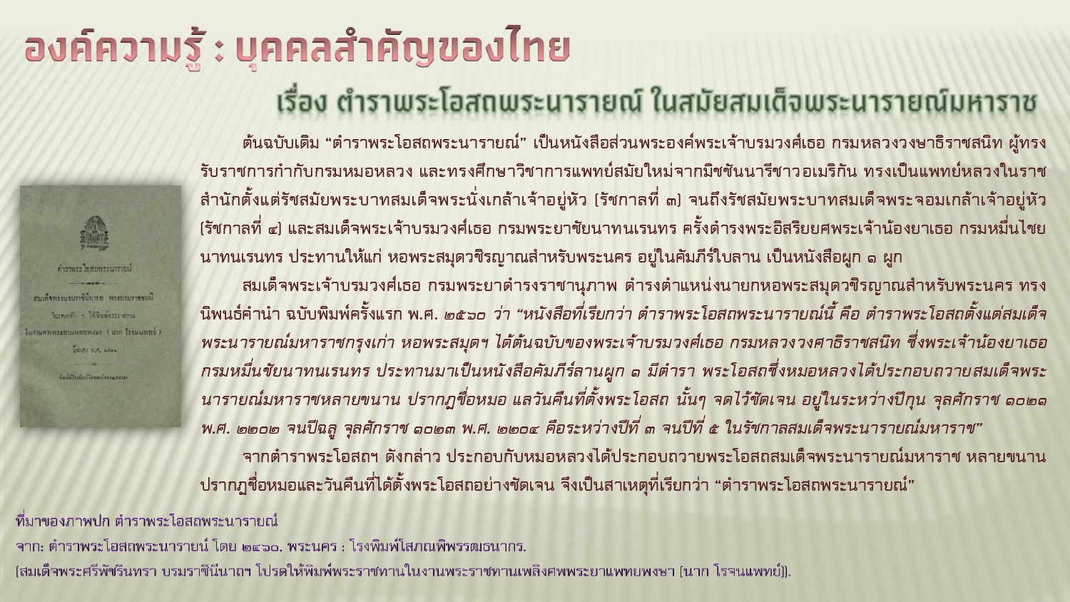 ตำราพระโอสถพระนารายน์. พระนคร : โรงพิมพ์โสภณพิพรรฒธนากร, ๒๔๖๐. (สมเด็จพระศรีพัชรินทราบรมราชินีนาถ พระบรมราชชนนีพันปีหลวง โปรดเกล้าฯ ให้พิมพ์พระราชทาน