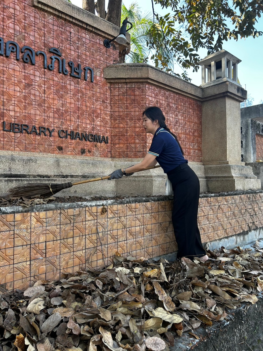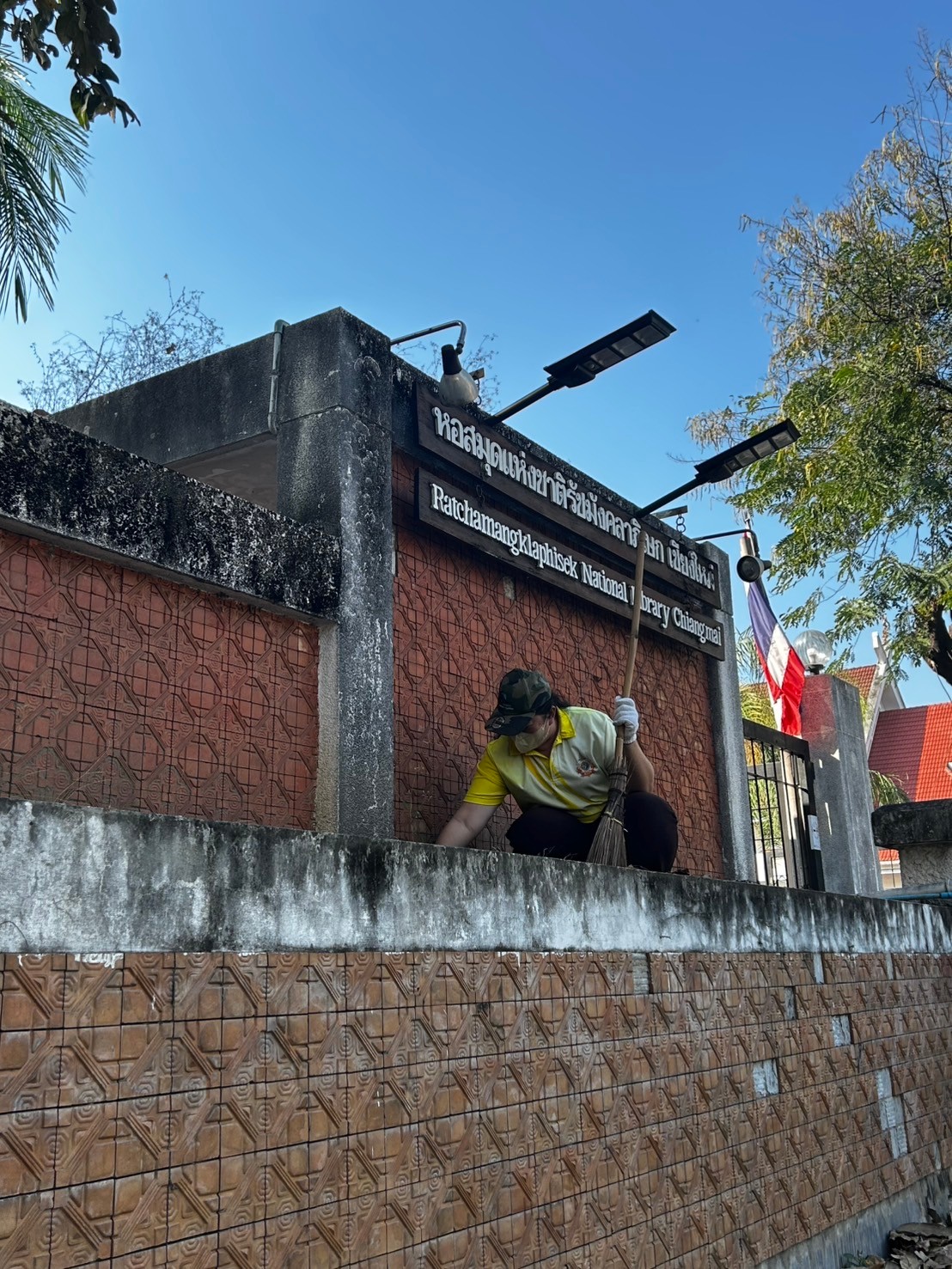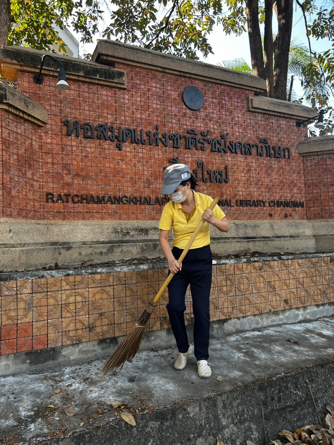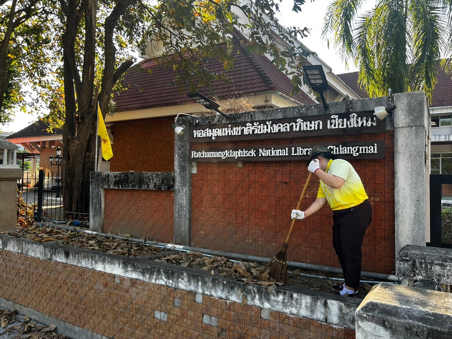 ผู้อำนวยการหอสมุดแห่งชาติรัชมังคลาภิเษก เชียงใหม่ พร้อมด้วยบุคลากรร่วมกันทำความสะอาด บริเวณด้านหน้าหอสมุดแห่งชาติรัชมังคลาภิเษก เชียงใหม่