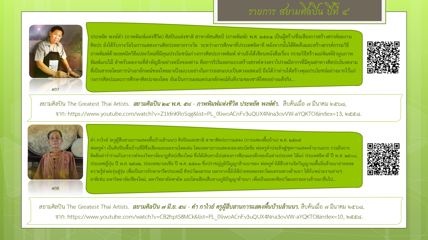 รายการ สยามศิลปิน ปีที่ ๔ เป็นรายการสารคดีอัตชีวประวัติศิลปินไทย ซึ่งผลิตขึ้นในนาม กรมส่งเสริมวัฒนธรรม และมูลนิธิศิลปินแห่งชาติ ได้แก่ พระบาทสมเด็จพระจอมเกล้าเจ้าอยู่หัว (พระราชบิดาแห่งการปฏิรูป), พระพรหมพิจิตร (ครูช่างผู้นำนวัตกรรมใหม่สู่สถาปัตยกรรมไทย), หนังฉิ้น ธรรมโฆษณ์ (ปราชญ์ผู้ขับเงาแห่งลุ่มทะเลสาบสงขลา), เนาวรัตน์ พงษ์ไพบูลย์ (กวีศรีรัตนโกสินทร์), หม่อมราชวงศ์ถนัดศรี สวัสดิวัตน์ (ศิลปินครอบจักรวาล), กฤษณา อโศกสิน (ไม้หอมแห่งบรรณพิภพ), ประหยัด พงษ์ดำ (ภาพพิมพ์แห่งชีวิต), คำ กาไวย์ (ครูผู้สืบสานการแสดงพื้นบ้านล้านนา), ดร.สุเมธ ชุมสาย ณ อยุธยา (สถาปนิกสองวัฒนธรรม), บุญเลิศ นาจพินิจ (ครูลิเกผู้สืบสานปณิธานครู), รองศาสตราจารย์ฤทัย ใจจงรัก (ผู้สืบสานและสร้างสรรค์สถาปัตยกรรมไทย) และจักรพันธุ์ โปษยกฤต (ผู้อนุรักษ์ สืบสาน และสร้างสรรค์มรดกศิลป์)
