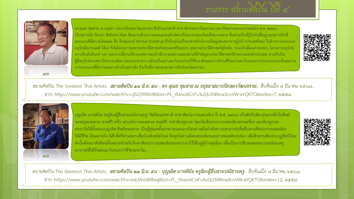 สยามศิลปิน The Greatest Thai Artists. สยามศิลปิน ๑๔ มิ.ย. ๕๘ - ดร สุเมธ ชุมสาย ณ อยุธยาสถาปนิกสองวัฒนธรรม. สืบค้นเมื่อ ๗ มีนาคม ๒๕๖๘,