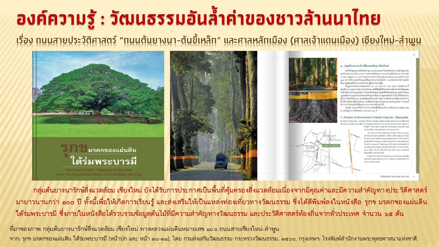 กรมส่งเสริมวัฒนธรรม กระทรวงวัฒนธรรม. รุกข มรดกของแผ่นดิน ใต้ร่มพระบารมี. กรุงเทพฯ: โรงพิมพ์สำนักงานพระพุทธศาสนาแห่งชาติ, ๒๕๖๐.
