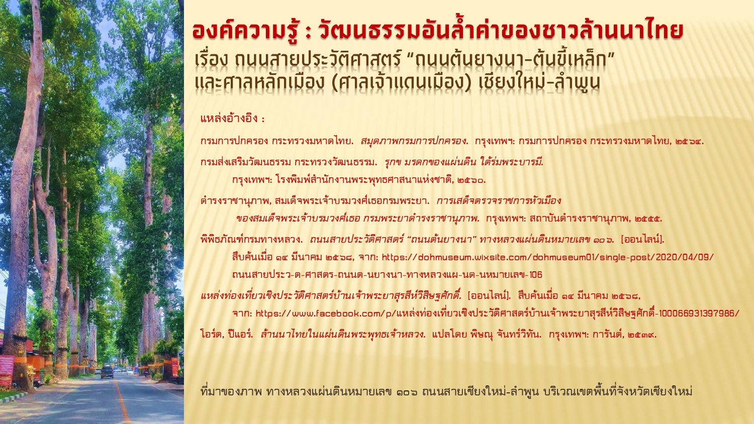 พิพิธภัณฑ์กรมทางหลวง. ถนนสายประวัติศาสตร์ “ถนนต้นยางนา” ทางหลวงแผ่นดินหมายเลข ๑๐๖. [ออนไลน์]. สืบค้นเมื่อ ๑๔ มีนาคม ๒๕๖๘,