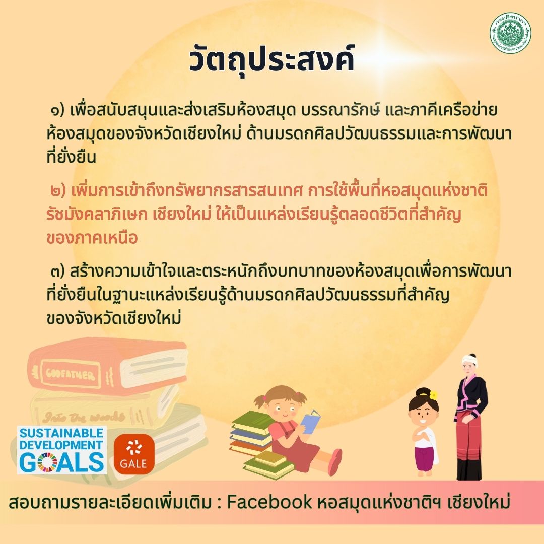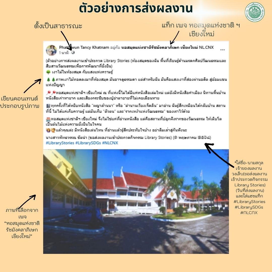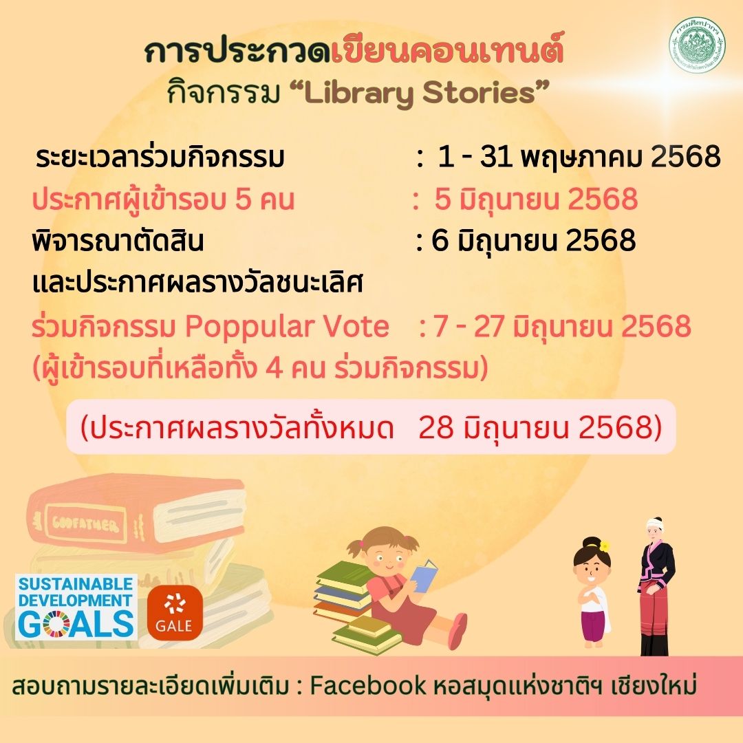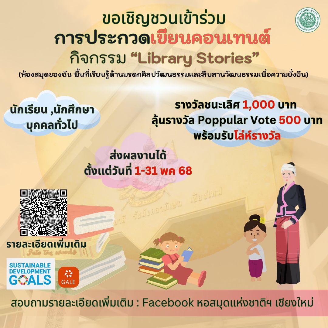 หอสมุดแห่งชาติรัชมังคลาภิเษก เชียงใหม่ ขอเชิญชวน นักเรียน นักศึกษา และประชาชนทั่วไป ร่วมประกวด กิจกรรม“Library Stories” หรือ ห้องสมุดของฉัน พื้นที่เรียนรู้ด้านมรดกศิลปวัฒนธรรมและสืบสานวัฒนธรรมเพื่อความยั่งยืน