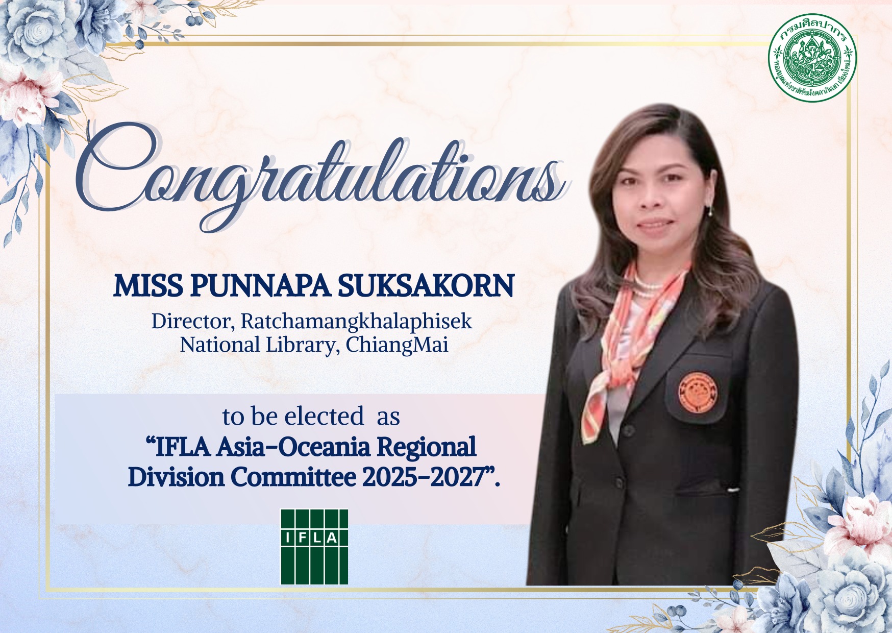ขอแสดงความยินดีกับ นางสาวปุณณภา สุขสาคร ผู้อำนวยการหอสมุดแห่งชาติรัชมังคลาภิเษก เชียงใหม่ ในโอกาสที่ได้รับเลือกตั้งให้เป็นคณะกรรมการสหพันธ์ระหว่างประเทศว่าด้วยสมาคมและสถาบันห้องสมุดสากลในระดับภูมิภาคเอเชียและโอเชียเนีย ปี ๒๕๖๘-๒๕๗๐ หรือ International Federation of Library Associations and Institutions, IFLA Asia - Oceania Regional Division Committee 2025-2027