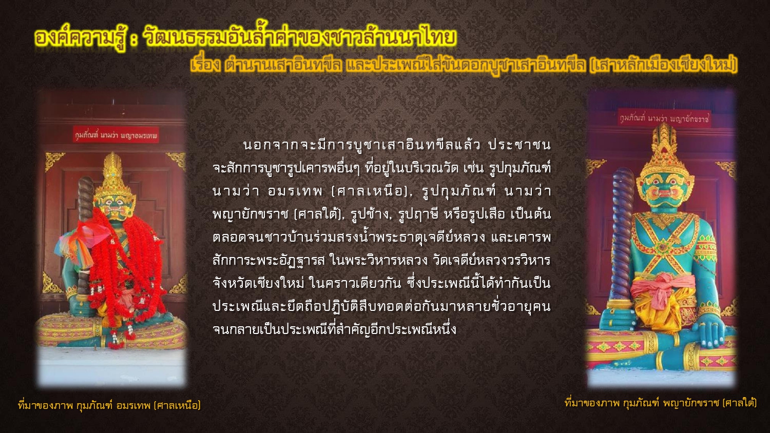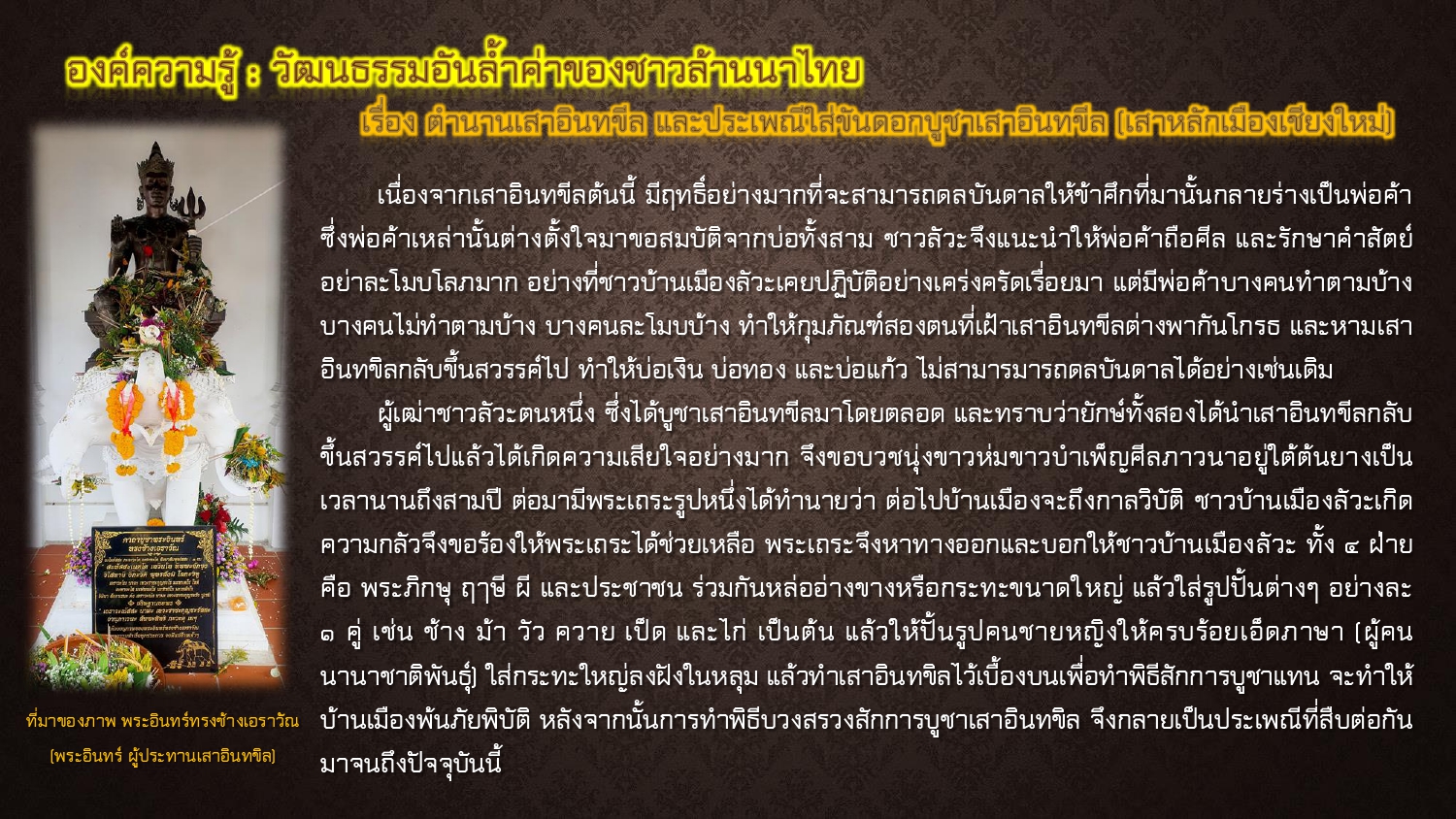 มิวเซียม สยาม. ประเพณีเข้าอินทขิล ตำนานอินทขิลและประเพณีบูชาอินทขิล. [ออนไลน์]. สืบค้นเมื่อ ๒๐ พฤษภาคม ๒๕๖๘,