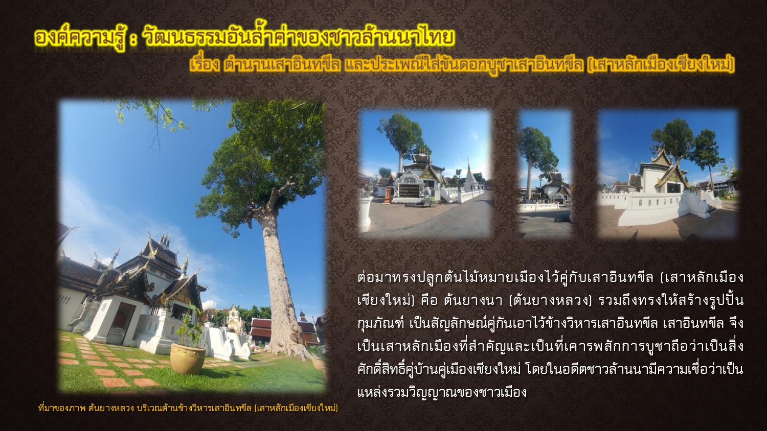 สนั่น ธรรมธิ. ประเพณีบูชาเสาอินทขีล. [ออนไลน์]. สืบค้นเมื่อ ๒๐ พฤษภาคม ๒๕๖๘, จาก: https://accl.cmu.ac.th/Knowledge/details/2637, ๒๕๖๕.