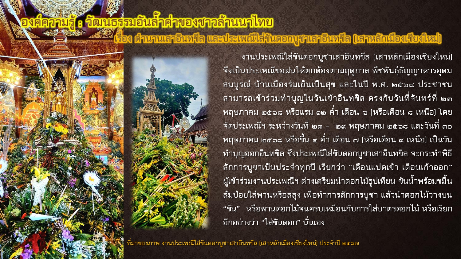 งานประเพณีใส่ขันดอกบูชาเสาอินทขีล (เสาหลักเมืองเชียงใหม่) จึงเป็นประเพณีขอฝนให้ตกต้องตามฤดูกาล พืชพันธุ์ธัญญาหารอุดมสมบูรณ์ บ้านเมืองร่มเย็นเป็นสุข และในปี พ.ศ. ๒๕๖๘ ประชาชนสามารถเข้าร่วมทำบุญในวันเข้าอินทขิล ตรงกับวันที่จันทร์ที่ ๒๓ พฤษภาคม ๒๕๖๘ หรือแรม ๑๒ ค่ำ เดือน ๖ (หรือเดือน ๘ เหนือ) โดยจัดประเพณีฯ ระหว่างวันที่ ๒๓ – ๒๙ พฤษภาคม ๒๕๖๘ และวันที่ ๓๐ พฤษภาคม ๒๕๖๘ หรือขึ้น ๔ ค่ำ เดือน ๗ (หรือเดือน ๙ เหนือ) เป็นวันทำบุญออกอินทขิล ซึ่งประเพณีใส่ขันดอกบูชาเสาอินทขีล จะกระทำพิธีสักการบูชาเป็นประจำทุกปี เรียกว่า “เดือนแปดเข้า เดือนเก้าออก” ผู้เข้าร่วมงานประเพณีฯ ต่างเตรียมนำดอกไม้ธูปเทียน ขันน้ำพร้อมขมิ้นส้มป่อยใส่พานหรือสลุง เพื่อทำการสักการบูชา แล้วนำดอกไม้วางบน “ขัน” หรือพานดอกไม้จนครบเหมือนกับการใส่บาตรดอกไม้ หรือเรียกอีกอย่างว่า “ใส่ขันดอก” นั่นเอง