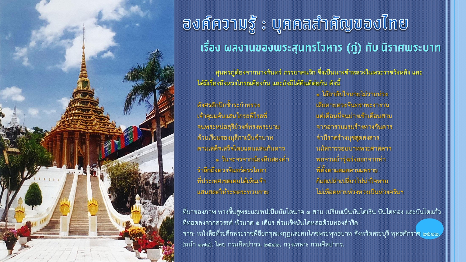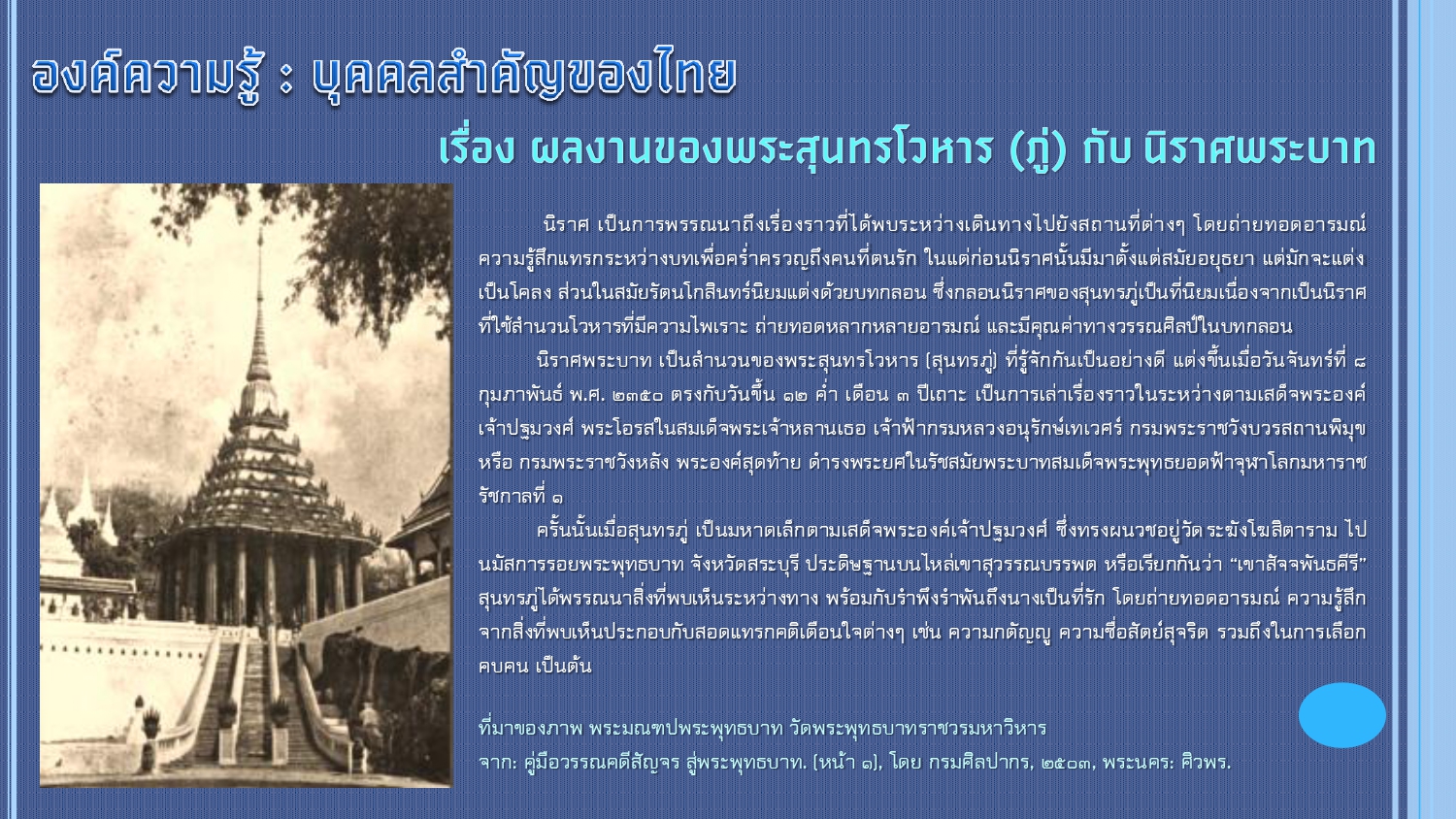 ห้องสมุดดิจิทัลวัชรญาณ. นิราศพระบาท. [ออนไลน์]. สืบค้นเมื่อ ๒๐ มิถุนายน ๒๕๖๘, จาก: https://vajirayana.org/ประชุมวรรณคดีเรื่อง-พระพุทธบาท/นิราศพระบาท