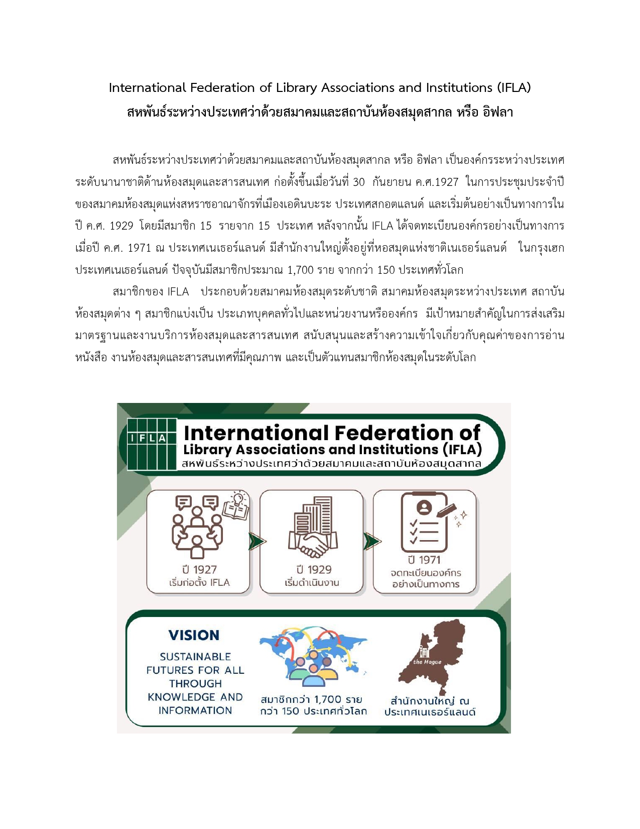International Federation of Library Associations and Institutions (IFLA) สหพันธ์ระหว่างประเทศว่าด้วยสมาคมและสถาบันห้องสมุดสากล หรือ อิฟลา