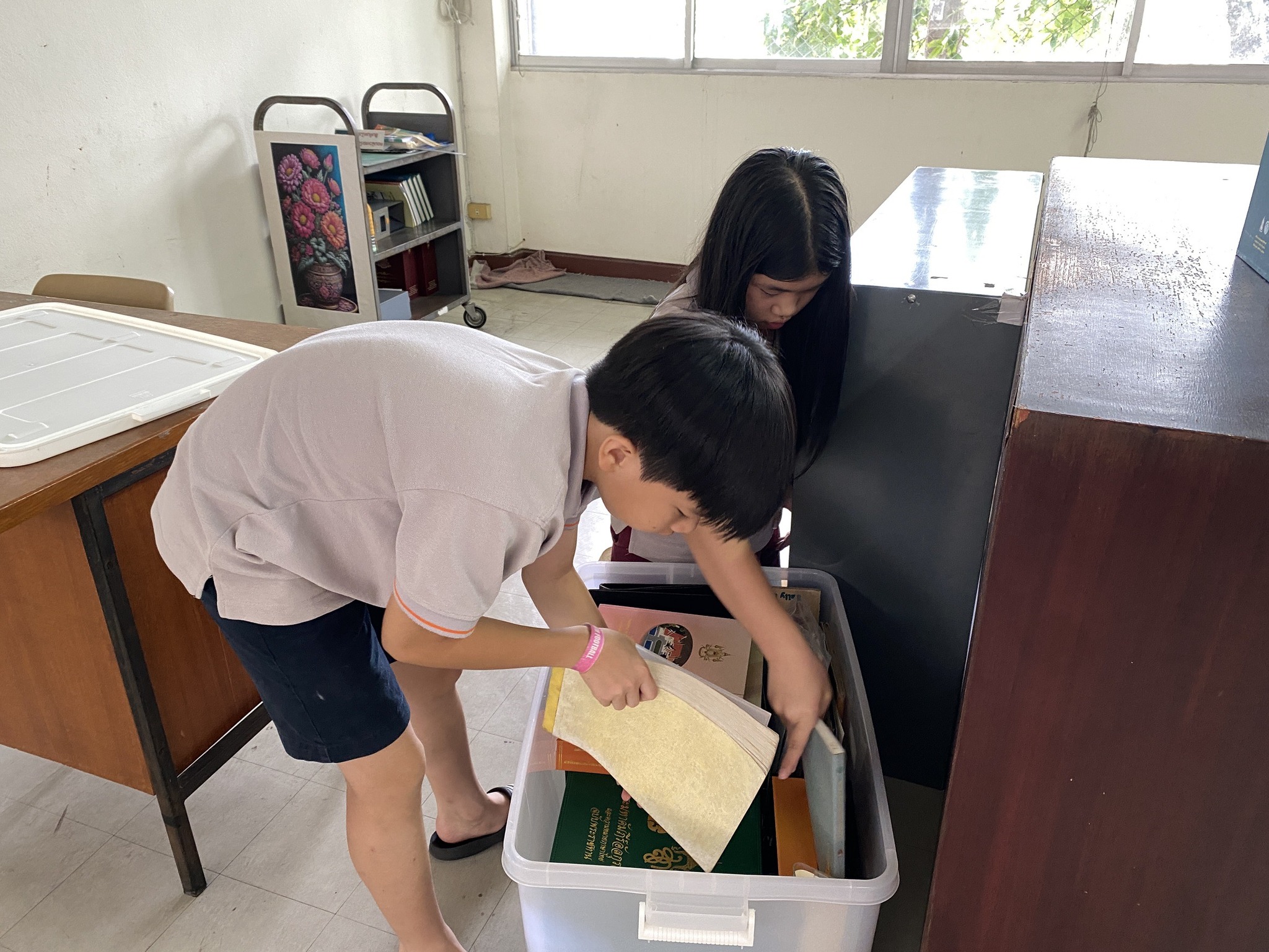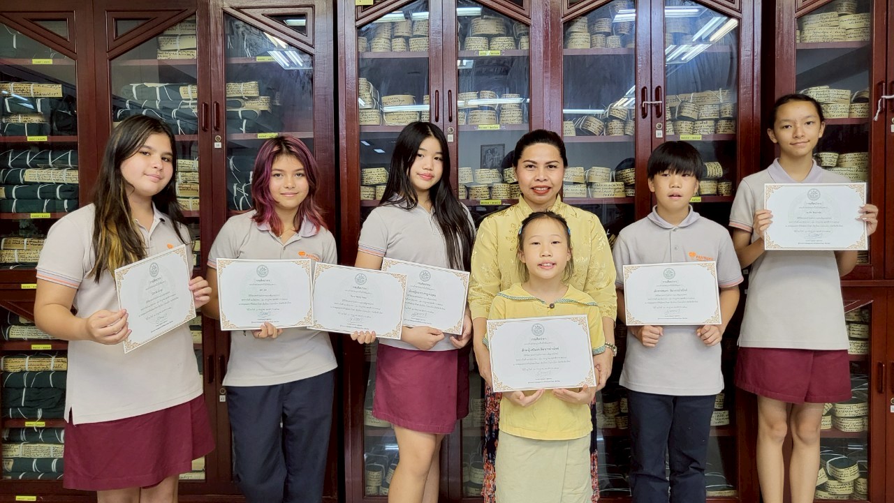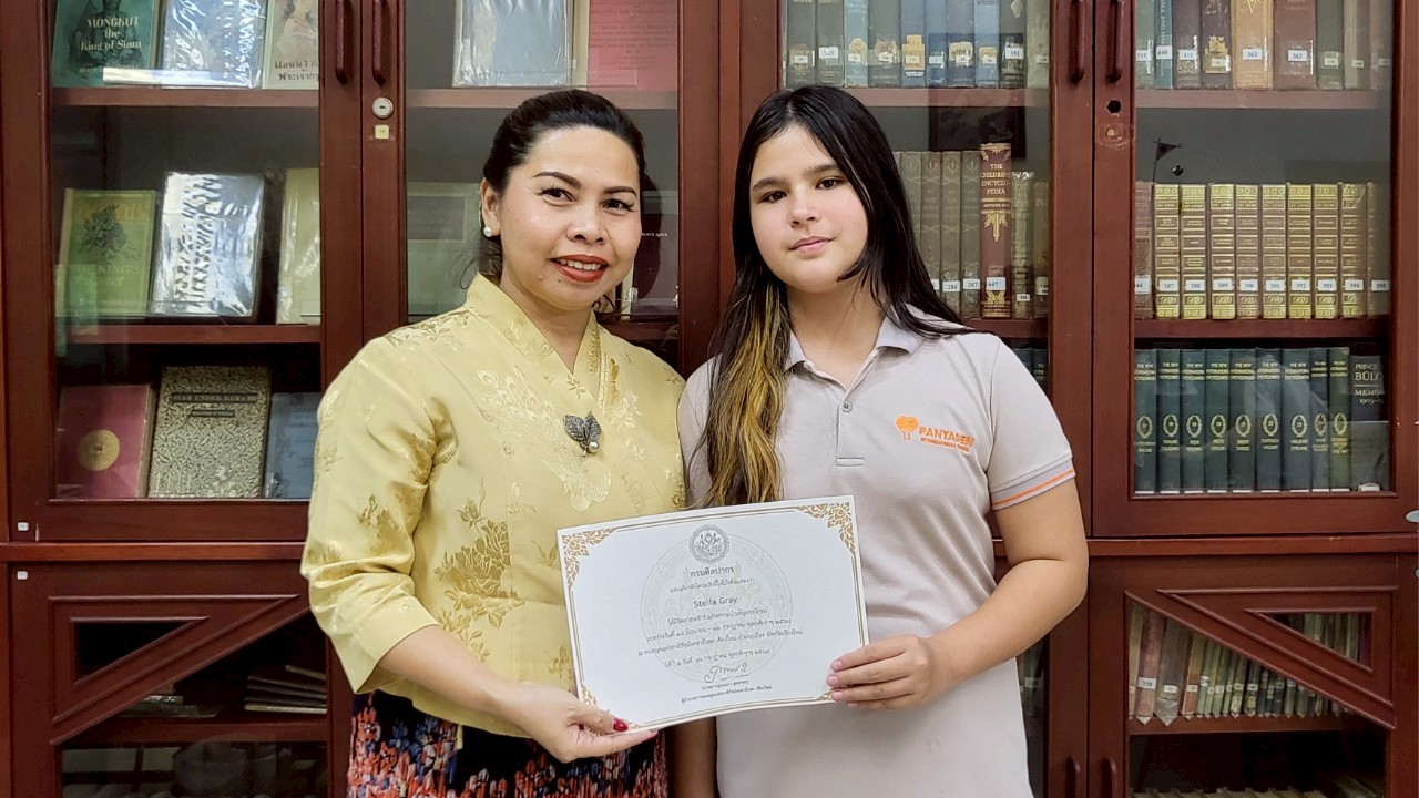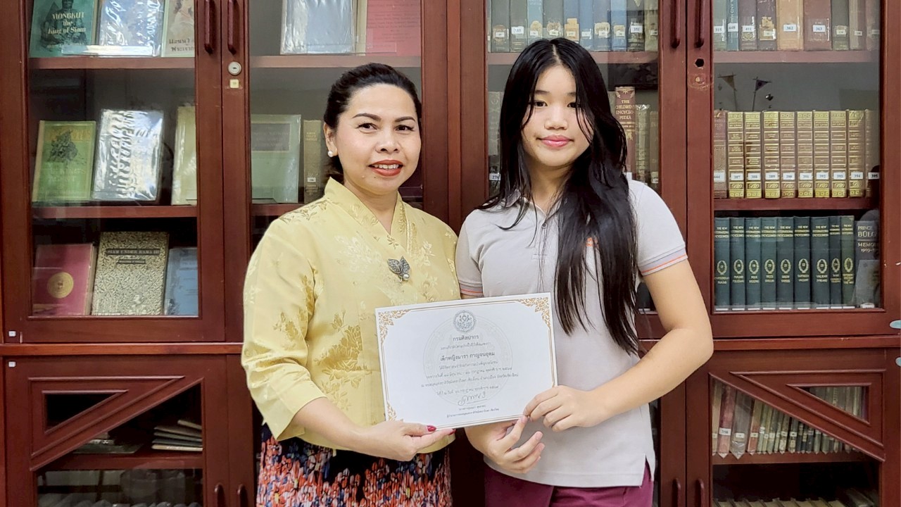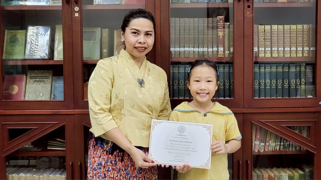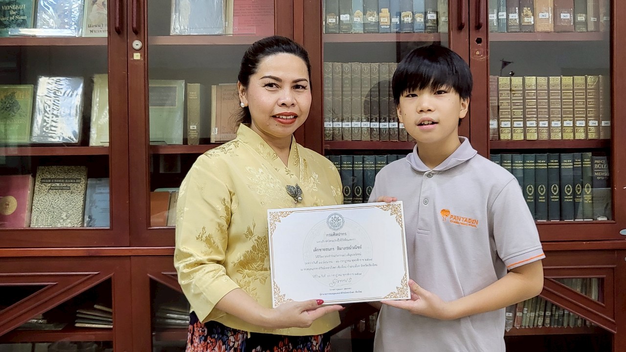 นางสาวปุณณภา สุขสาคร ผู้อำนวยการหอสมุดแห่งชาติรัชมังคลาภิเษก เชียงใหม่ มอบเกียรติบัตรให้แก่เยาวชนจิตอาสา จากโรงเรียนนานาชาติปัญญาเด่น (Panyaden International School)