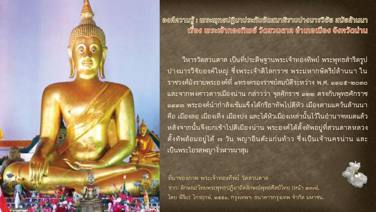 เมื่อพระเจ้าติโลกราชยึดเมืองได้แล้วโปรดเกล้าฯ ให้สร้างขึ้นเมื่อปี พ.ศ. ๑๙๙๓ เพื่อให้เป็นอนุสรณ์สักขีพยานในชัยชนะของพระองค์สามารถยึดเมืองน่านไว้ในพระราชอำนาจได้ โดยมิได้เสียชีวิตของไพร่พลทั้งสองฝ่าย จึงโปรดให้สร้างพระพุทธรูปทองสำริดองค์ใหญ่ประทับขัดสมาธิราบปางมารวิชัย ประดิษฐานในวิหารวัดสวนตาล มีหน้าตักกว้าง ๑๐ ฟุต สูง ๑๔ ฟุต ๔ นิ้ว และในสมัยนั้นได้ใช้ทองคำมากที่สุดในแผ่นดินล้านนา