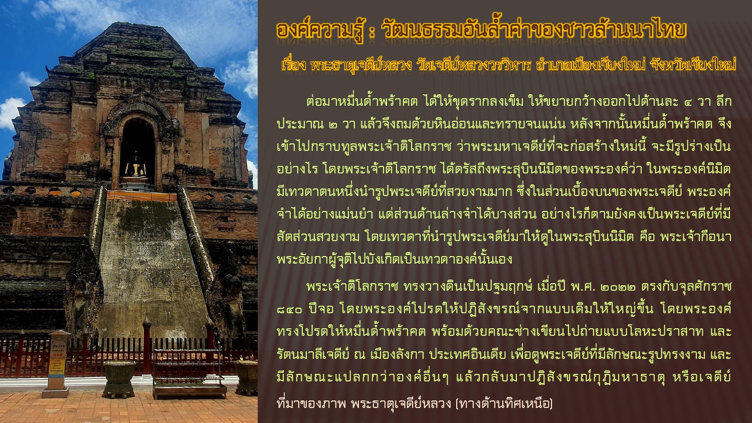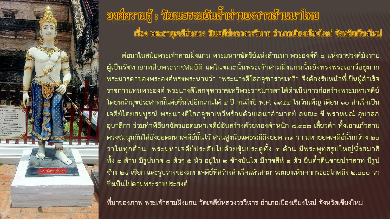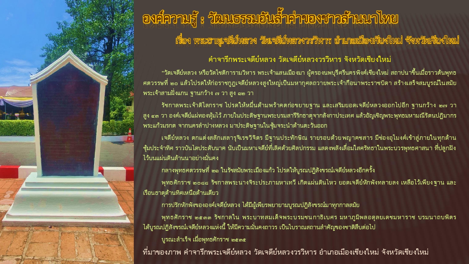 เรียบเรียงโดย : นายธีรบูลย์ มิตรมโนชัย นักวิชาการโสตทัศนศึกษาชำนาญการ หอสมุดแห่งชาติรัชมังคลาภิเษก เชียงใหม่ สำนักศิลปากรที่ ๗ เชียงใหม่ กรมศิลปากร กระทรวงวัฒนธรรม