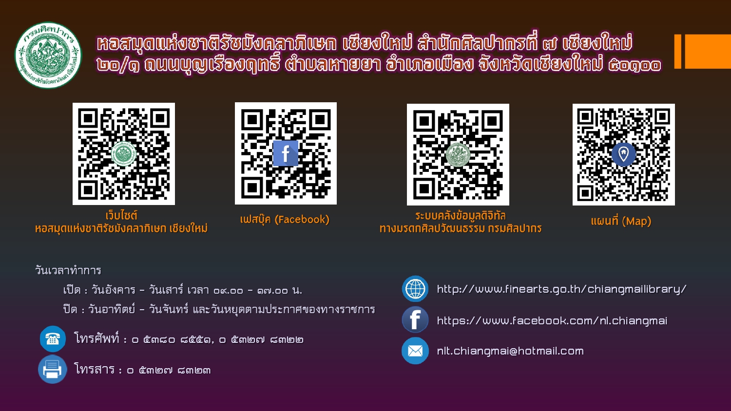 เรียบเรียงโดย : นายธีรบูลย์ มิตรมโนชัย นักวิชาการโสตทัศนศึกษาชำนาญการ หอสมุดแห่งชาติรัชมังคลาภิเษก เชียงใหม่ สำนักศิลปากรที่ ๗ เชียงใหม่ กรมศิลปากร กระทรวงวัฒนธรรม