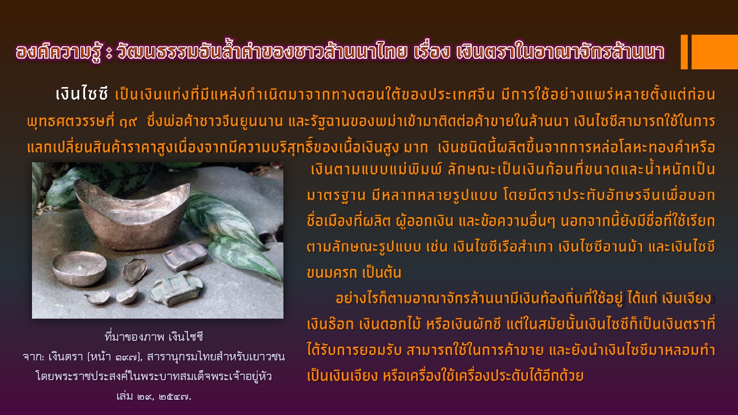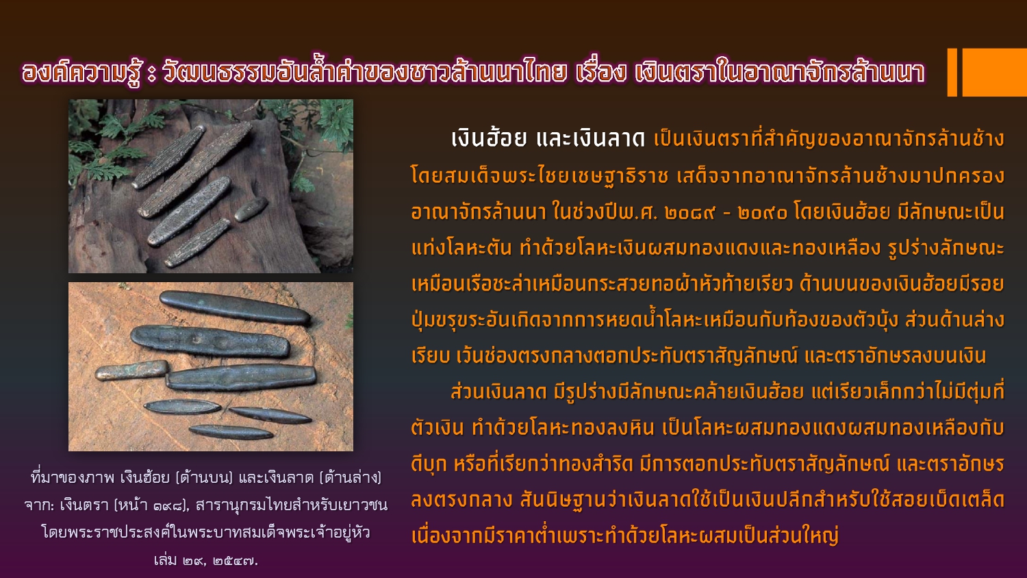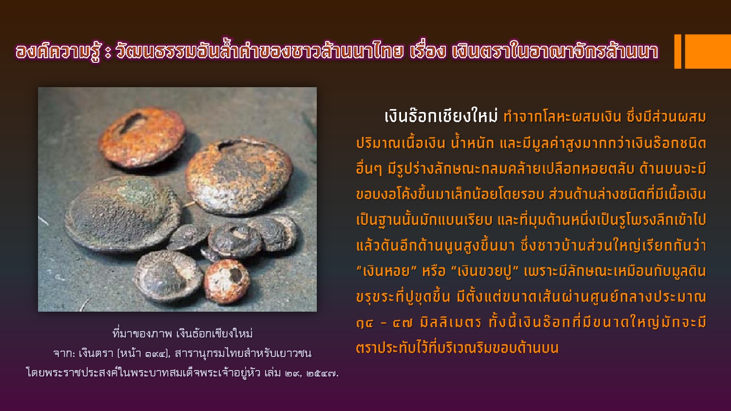 บุปผา คุณยศยิ่ง และศรีเลา เกษพรหม. "เงินตรา." สารานุกรมวัฒนธรรมไทย ภาคเหนือ. ๓. (๒๕๔๒): ๑๓๙๑-๑๓๙๖.