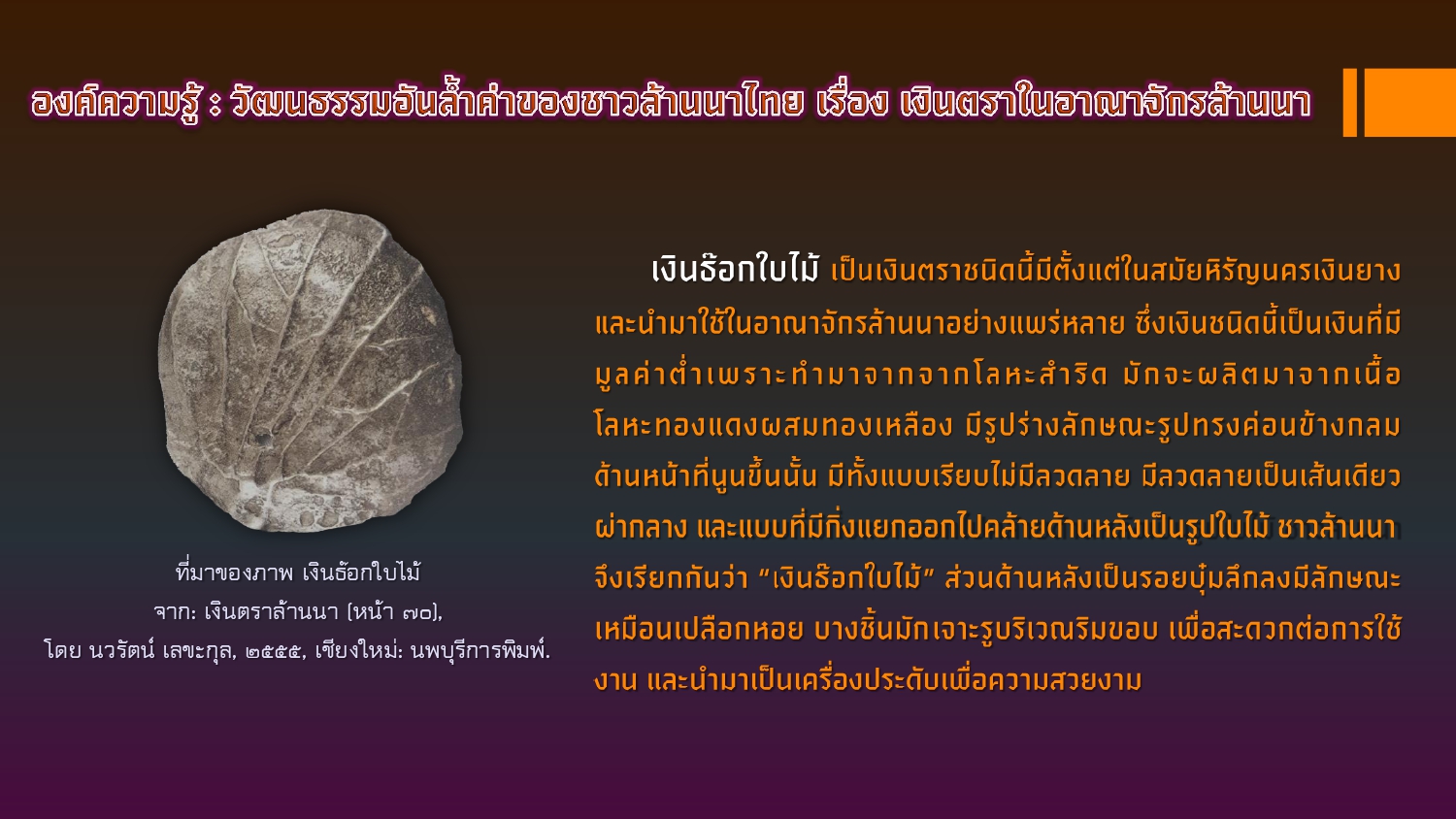 นวรัตน์ เลขะกุล. เงินตราล้านนา. เชียงใหม่: นพบุรีการพิมพ์, ๒๕๕๕.