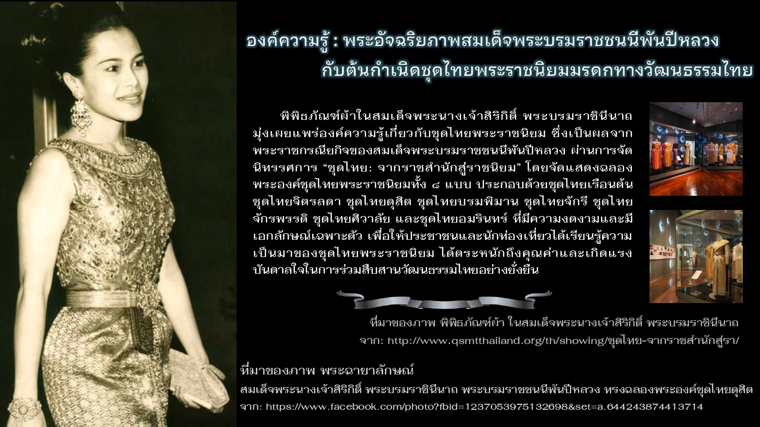 พิพิธภัณฑ์ผ้าในสมเด็จพระนางเจ้าสิริกิติ์ พระบรมราชินีนาถ. ชุดไทย: จากราชสำนักสู่ราชนิยม. [ออนไลน์]. สืบค้นเมื่อ ๕ พฤศจิกายน ๒๕๖๘,