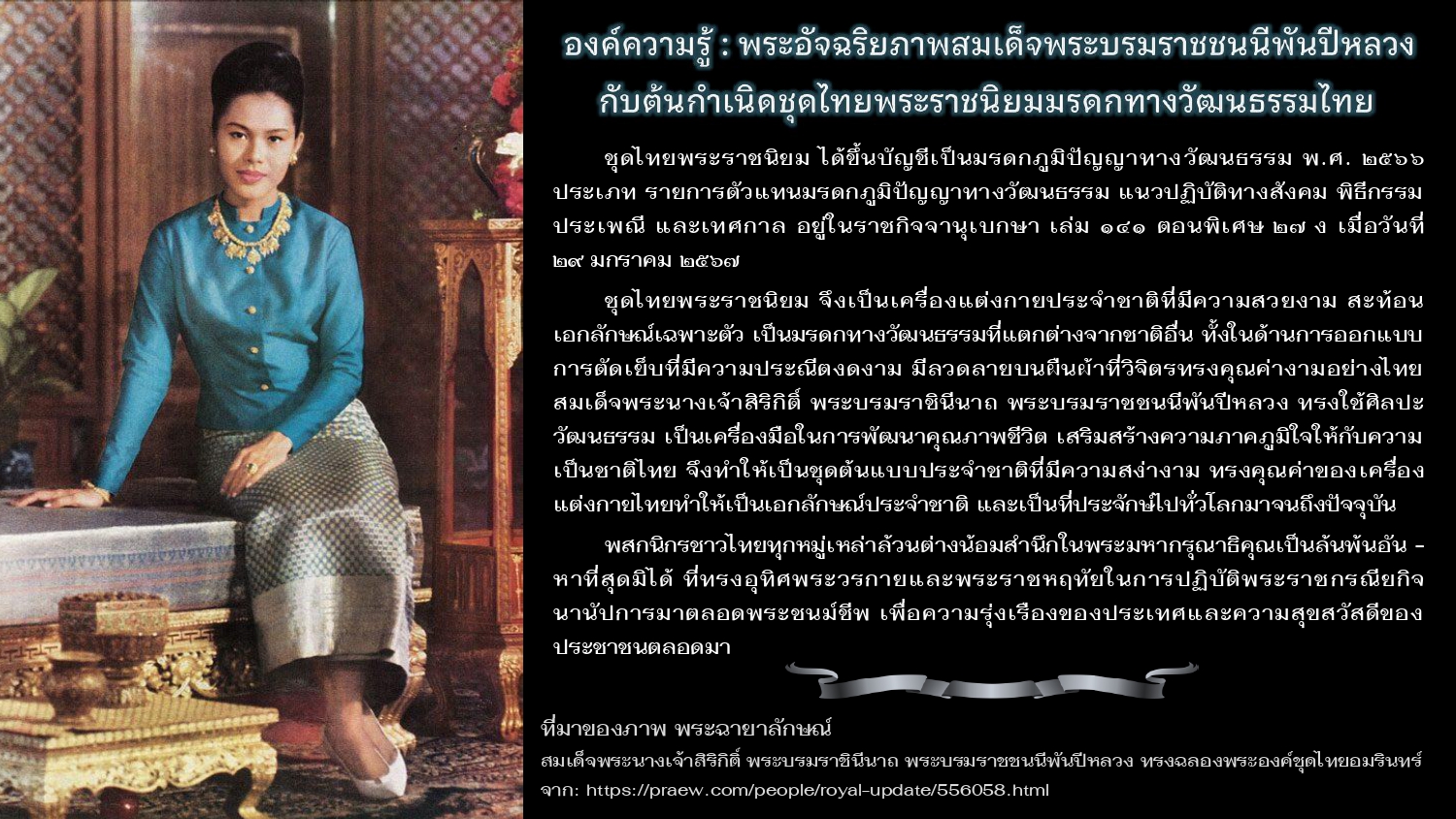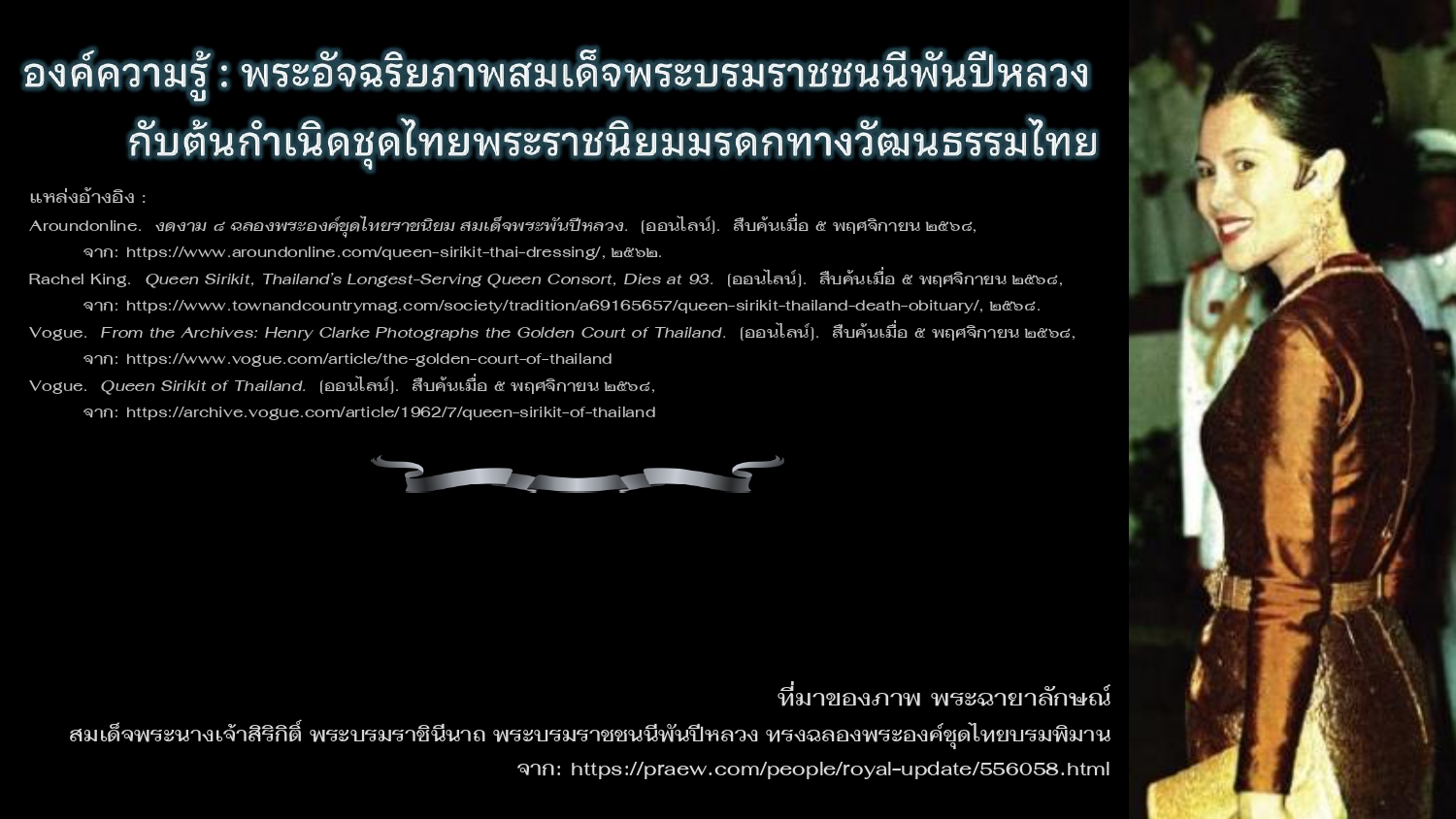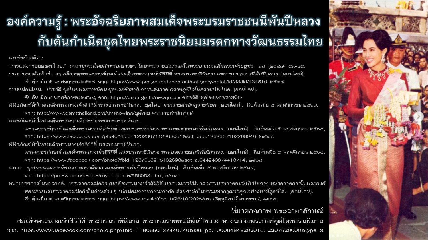 แพรว. ชุดไทยพระราชนิยม มรดกชาติจาก สมเด็จพระพันปีหลวง. [ออนไลน์]. สืบค้นเมื่อ ๕ พฤศจิกายน ๒๕๖๘,