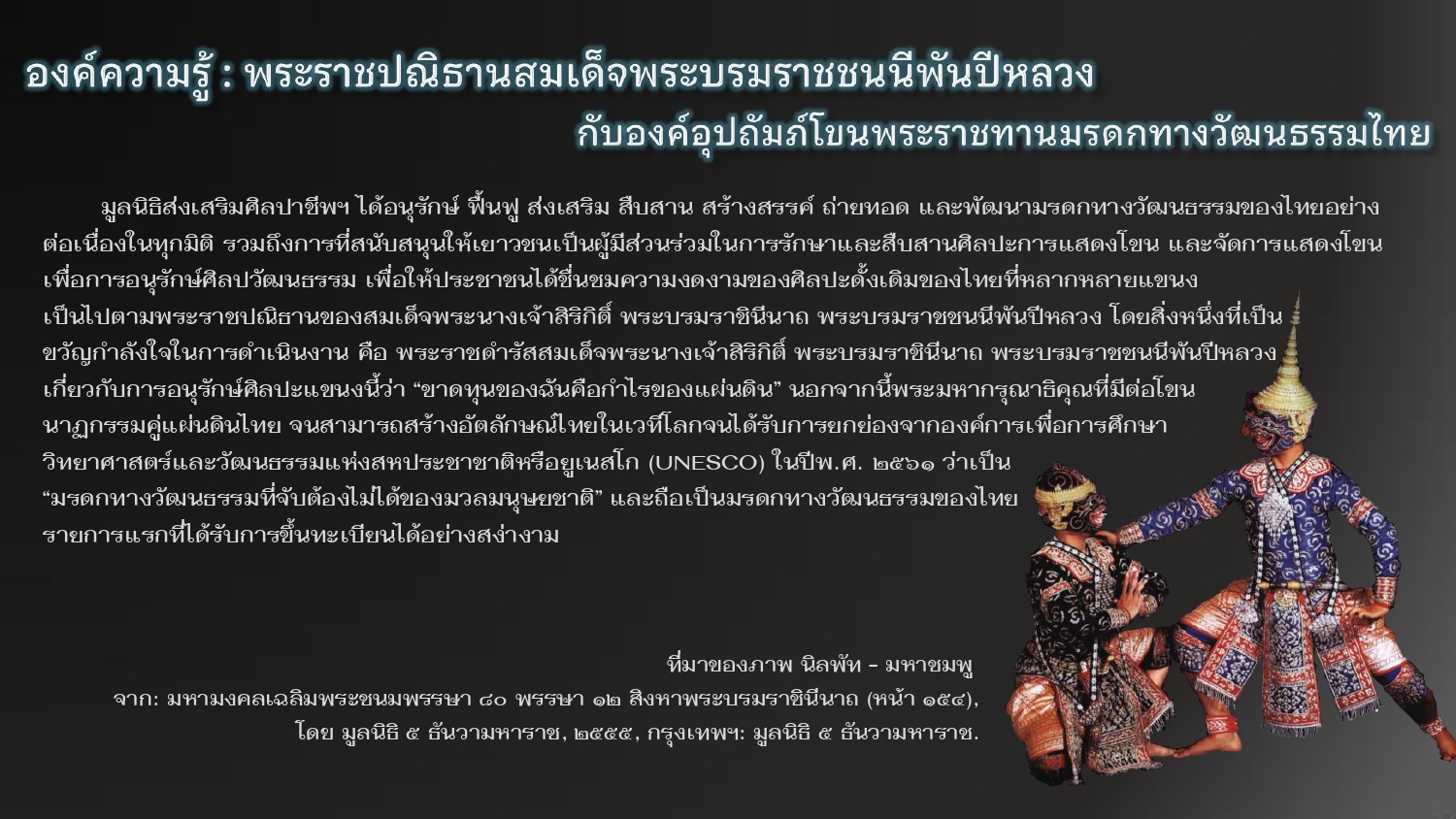 มูลนิธิส่งเสริมศิลปาชีพฯ ได้อนุรักษ์ ฟื้นฟู ส่งเสริม สืบสาน สร้างสรรค์ ถ่ายทอด และพัฒนามรดกทางวัฒนธรรมของไทยอย่างต่อเนื่องในทุกมิติ รวมถึงการที่สนับสนุนให้เยาวชนเป็นผู้มีส่วนร่วมในการรักษาและสืบสานศิลปะการแสดงโขน และจัดการแสดงโขนเพื่อการอนุรักษ์ศิลปวัฒนธรรม เพื่อให้ประชาชนได้ชื่นชมความงดงามของศิลปะดั้งเดิมของไทยที่หลากหลายแขนง เป็นไปตามพระราชปณิธานของสมเด็จพระนางเจ้าสิริกิติ์ พระบรมราชินีนาถ พระบรมราชชนนีพันปีหลวง โดยสิ่งหนึ่งที่เป็นขวัญกำลังใจในการดำเนินงาน คือ พระราชดำรัสสมเด็จพระนางเจ้าสิริกิติ์ พระบรมราชินีนาถ พระบรมราชชนนีพันปีหลวง เกี่ยวกับการอนุรักษ์ศิลปะแขนงนี้ว่า “ขาดทุนของฉันคือกำไรของแผ่นดิน” นอกจากนี้พระมหากรุณาธิคุณที่มีต่อโขน นาฏกรรมคู่แผ่นดินไทย จนสามารถสร้างอัตลักษณ์ไทยในเวทีโลกจนได้รับการยกย่องจากองค์การเพื่อการศึกษา วิทยาศาสตร์และวัฒนธรรมแห่งสหประชาชาติหรือยูเนสโก (UNESCO) ในปีพ.ศ. ๒๕๖๑ ว่าเป็น “มรดกทางวัฒนธรรมที่จับต้องไม่ได้ของมวลมนุษยชาติ” และถือเป็นมรดกทางวัฒนธรรมของไทยรายการแรกที่ได้รับการขึ้นทะเบียนได้อย่างสง่างาม