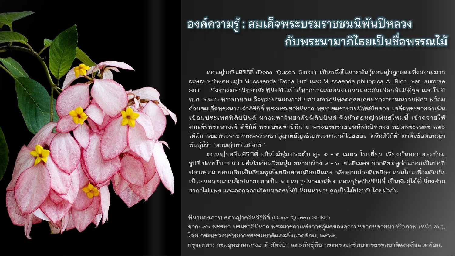 สมเด็จพระนางเจ้าสิริกิติ์ พระบรมราชินีนาถ พระบรมราชชนนีพันปีหลวง ทรงสนพระราชหฤทัยในพืชพรรณต่างๆ มาโดยตลอด โดยได้ทรงชื่นชมพืชพรรณหายากและดอกไม้ป่า ซึ่งในกรณีที่มีมีการพัฒนาปรับปรุงพันธุ์พืชให้มีลักษณะเด่นที่มีความสวยงามหายาก ทรงคุณค่า หรือเป็นพรรณไม้ที่ค้นพบใหม่จนเป็นที่ประจักษ์ ทางหน่วยงานและสถาบันต่างๆ ที่เกี่ยวข้องทั้งในและต่างประเทศ จะทำการขอพระราชทานพระราชานุญาตอัญเชิญพระนามาภิไธย มาตั้งเป็นชื่อของพรรณไม้ ได้แก่ แคทลียาควีนสิริกิติ์, กุหลาบควีนสิริกิติ์, ดอนญ่าควีนสิริกิติ์, โมกราชินี, มหาพรหมราชินี, บัวศรีกิตติยา และบัวควีนสิริกิติ์ จึงนับว่าเป็นพระมหากรุณาธิคุณอันหาที่สุดมิได้ ที่ได้ทรงอนุรักษ์พรรณไม้ไว้ เพื่อให้อนุชนรุ่นหลังได้ชื่นชมคุณค่าและความงามของพรรณไม้เหล่านี้ไว้ตลอดไป
