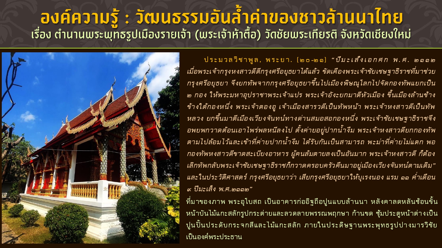 เรียบเรียงโดย : นายธีรบูลย์ มิตรมโนชัย นักวิชาการโสตทัศนศึกษาชำนาญการ หอสมุดแห่งชาติรัชมังคลาภิเษก เชียงใหม่ สำนักศิลปากรที่ ๗ เชียงใหม่ กรมศิลปากร กระทรวงวัฒนธรรม