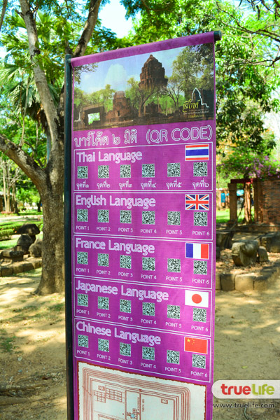เมื่อเราเข้ามาภายในบริเวณปราสาทเมืองสิงห์จะมีป้าย QR Code หลากหลายภาษาทั้ง ไทย อังกฤษ ฝรั่งเศส ญี่ปุ่น และจีน อำนวยความสะดวก แนะนำประวัติศาสตร์ และสถานที่สำคัญต่างๆ ของปราสาทเมืองสิงห์ให้กับนักท่องเที่ยวค่ะ