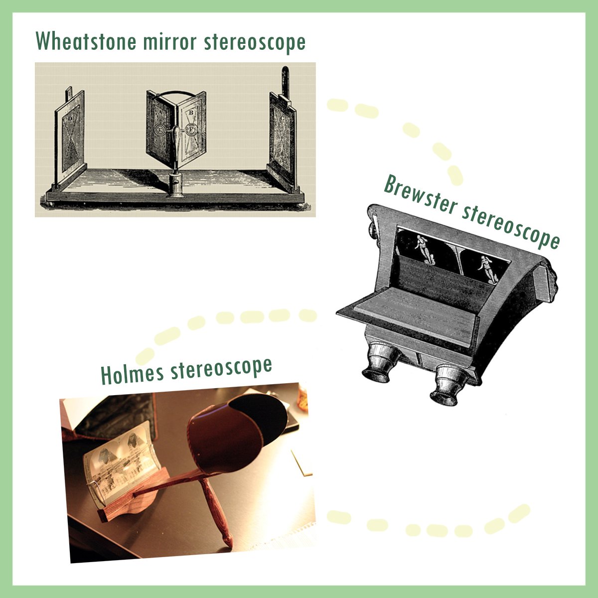 กล้อง 3 มิติแรกถูกคิดค้นและประดิษฐ์โดย ‘Sir Charles Wheatstone’ นักวิทยาศาสตร์ชาวอังกฤษ ในปี 1832 เป็นกล้องแบบกระจกสะท้อน โดยใช้กระจก 2 บาน วางทำมุม 45 องศา เพื่อให้สายตาคนดูมองเห็นภาพสะท้อนในแต่ละด้าน และได้ถูกปรับปรุงโดย ‘David Brewster’ นักวิทยาศาสตร์ชาวอังกฤษ ในปี 1849 ให้เป็นแบบกล้อง 2 เลนส์ที่ใช้ส่องและมองเห็นภาพ โดยเขาเรียกว่า “lenticular stereo scope” จนกลายเป็นกล้อง 3 มิติแรกที่สามารถพกพาได้ ต่อมา ‘Oliver Wendell Holmes’ นักฟิสิกส์ชาวอเมริกันได้พัฒนารูปแบบกล้องให้เพรียวบาง สามารถพกพาถือด้วยมือได้ง่ายขึ้น แถมราคาประหยัด จนกลายเป็นความบันเทิงชิ้นโปรดประจำบ้านและห้องเรียนในยุคนั้น