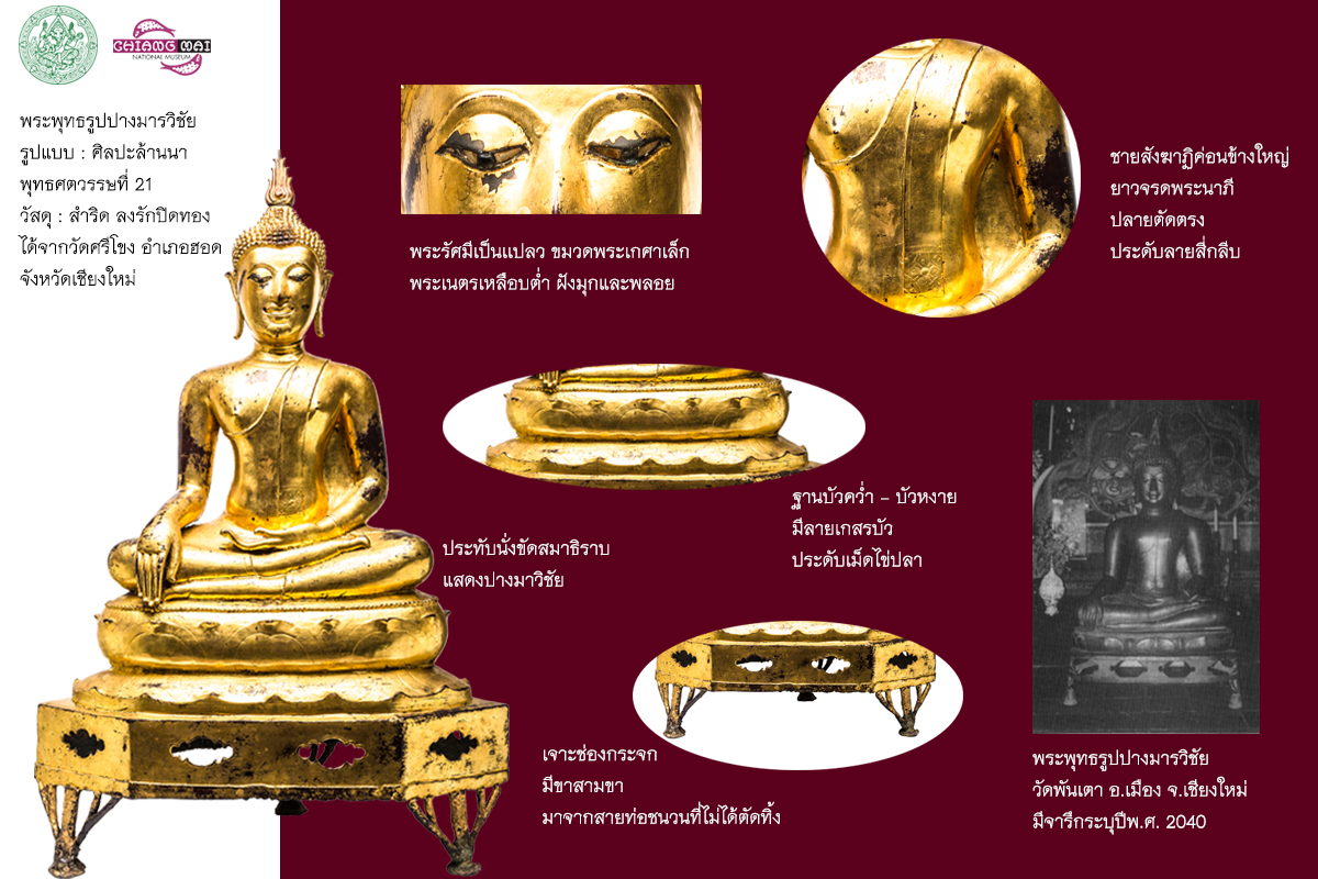 ลักษณะ : พระพุทธรูปประทับนั่งขัดสมาธิราบ แสดงปางมารวิชัย มีพระรัศมีเป็นเปลว ขมวดพระเกศาเล็ก พระเนตรหรี่เหลือบต่ำฝังมุกและพลอย ครองจีวรห่มเฉียง ชายสังฆาฏิยาวจรดพระนาภีปลายเป็นรูปลายสี่กลีบ ฐานเป็นแบบบัวคว่ำ- บัวหงาย มีลายเกสรบัว มีประดับเม็ดไข่ปลา รองรับด้วยฐานหกเหลี่ยม เจาะช่องกระจก และมีขาสามขา