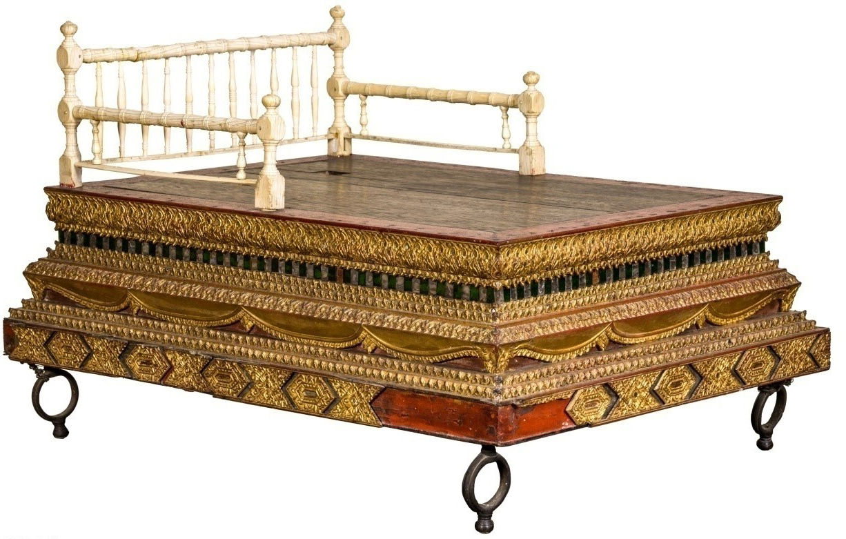 เสลี่ยง ลักษณะเป็นไม้แกะสลักลงรักปิดทองล่องชาด ทรงสี่เหลี่ยม ฐานล่างแกะลายลูกฟักสลับกับลายก้ามปู เหนือขึ้นไปทำลายแข้งสิงห์และนมสิงห์ จากนั้นจึงเป็นชั้นฐานบัว ที่ท้องไม้ประดับกระจก ด้านล่างสุดมีห่วงกลมสำหรับสอดไม้คานหามอยู่สี่ที่ พนักพิงและเท้าแขนทำจากงาช้าง