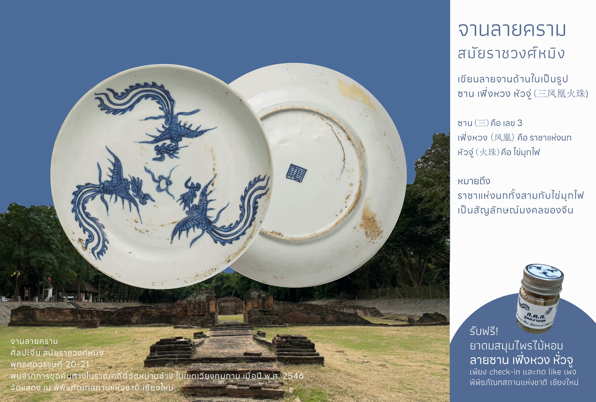 จานลายครามสมัยราชวงศ์หมิงใบหนึ่ง ที่พบจากการขุดค้นทางโบราณคดีที่วัดหนานช้าง ในเขตเวียงกุมกาม อำเภอสารภี จังหวัดเชียงใหม่ มีการเขียนภาพ ซาน เฟิ่งหวง หั่วจู หรือ ราชาแห่งนกทั้งสามกับไข่มุกไฟ ซึ่งมีความหมายมงคล ดังนี้