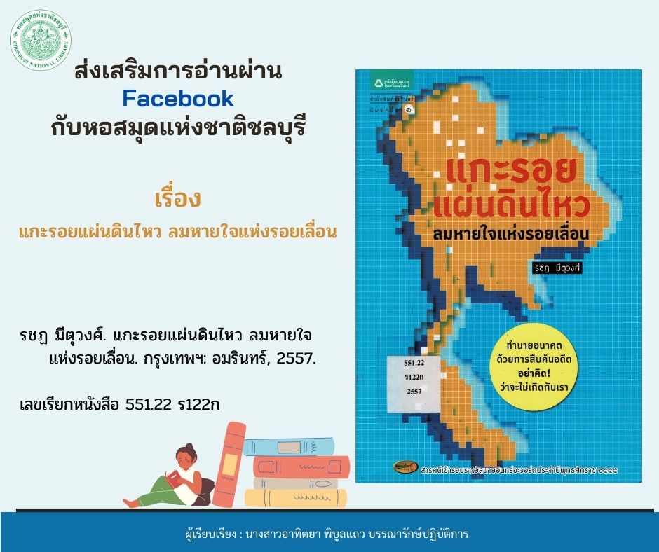 แกะรอยแผ่นดินไหว ลมหายใจแห่งรอยเลื่อน เล่มนี้ ผู้เขียนพาเราไปพบกับ การเกิดแผ่นดินไหวในประเทศไทยซึ่งนับเป็นภัยธรรมชาติที่มีโอกาสเกิดขึ้นได้ไม่ต่างจากภัยแล้ง น้ำท่วม ภัยหนาว พายุ หรือดินถล่ม เพียงแต่หลายคนยังมองว่าเป็นเรื่องไกลตัว หากลองย้อนรอยประวัติศาสตร์จะพบว่าภัยแผ่นดินไหวในประเทศไทยไม่ใช่เรื่องแปลกใหม่ มีทั้งขนาดเล็กและขนาดใหญ่ บางครั้งไม่ก่อให้เกิดความเสียหายแก่ทรัพย์สินแต่ก็สร้างความตื่นตระหนกและหวาดกลัวได้ไม่น้อย และในบางครั้งก็ก่อให้เกิดความสูญเสียที่ไม่อาจประเมินค่าได้ ดังเช่นเหตุการณ์คลื่นยักษ์สึนามิที่บริเวณชายฝั่งทะเลอันดามันของไทย มาตรการป้องกันอันตรายจากแผ่นดินไหวจึงถูกกำหนดขึ้น เช่น การกำหนดพื้นที่ความเสี่ยงภัยแผ่นดินไหวแบ่งตามระดับความเสี่ยง การกำหนดมาตรฐานการออกแบบอาคารให้มีความต้านทานแผ่นดินไหวที่เหมาะสม เป็นต้น เพราะการเกิดแผ่นดินไหวไม่สามารถคาดการณ์ล่วงหน้าได้ว่ารอยเลื่อนใดหรือบริเวณใดของเปลือกโลกจะเกิดการขยับตัว และหากขยับตัวแล้วจะมีความลึกหรือความรุนแรงมากน้อยเพียงใด รอยเลื่อนดังกล่าวเรียกว่า รอยเลื่อนมีพลัง (Active Fault) หมายถึง รอยเลื่อนที่มีประวัติการเลื่อนตัวอย่างน้อย 1 ครั้ง ในช่วงเวลา 11,000 ปี ประเทศไทยปรากฏรอยเลื่อนเหล่านี้ทั้งสิ้น 14 กลุ่มใหญ่ พาดผ่านพื้นที่ 21 จังหวัด ผู้เขียนนำเสนอเรื่องราวการสำรวจร่องรอยของการเกิดแผ่นดินไหวและถ่ายทอดข้อมูลที่ได้จากการศึกษาวิจัยอย่างต่อเนื่อง เพื่อประโยชน์ต่อการเรียนรู้ สร้างความตระหนักให้เกิดกับคนในสังคม เพื่อที่จะรับมือกับภัยแผ่นดินไหวได้อย่างสมดุลและปลอดภัย ผู้สนใจสามารถหาอ่านได้ที่หอสมุดแห่งชาติชลบุรี (วันอังคาร – วันเสาร์ เวลา 09.00 - 17.00 น.)