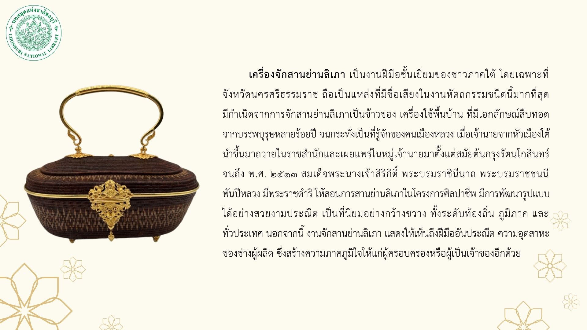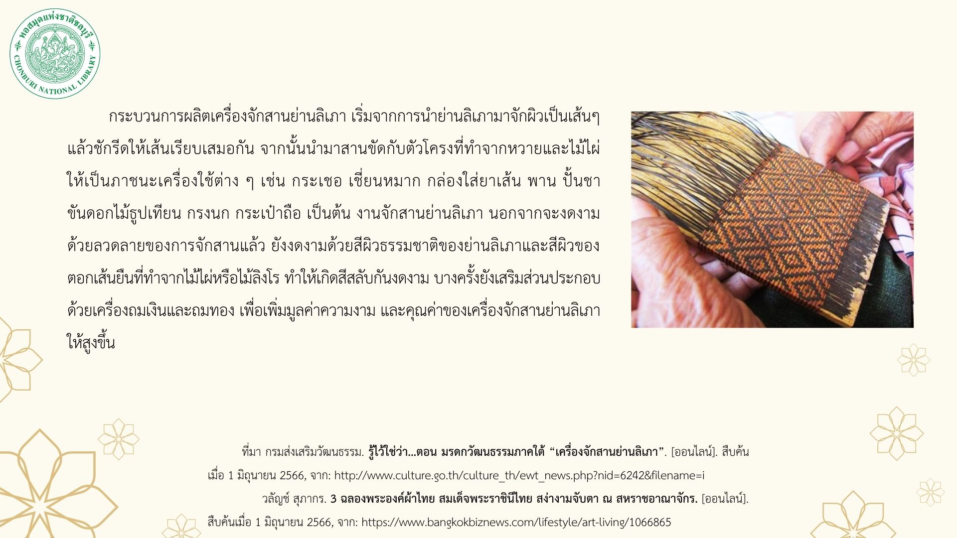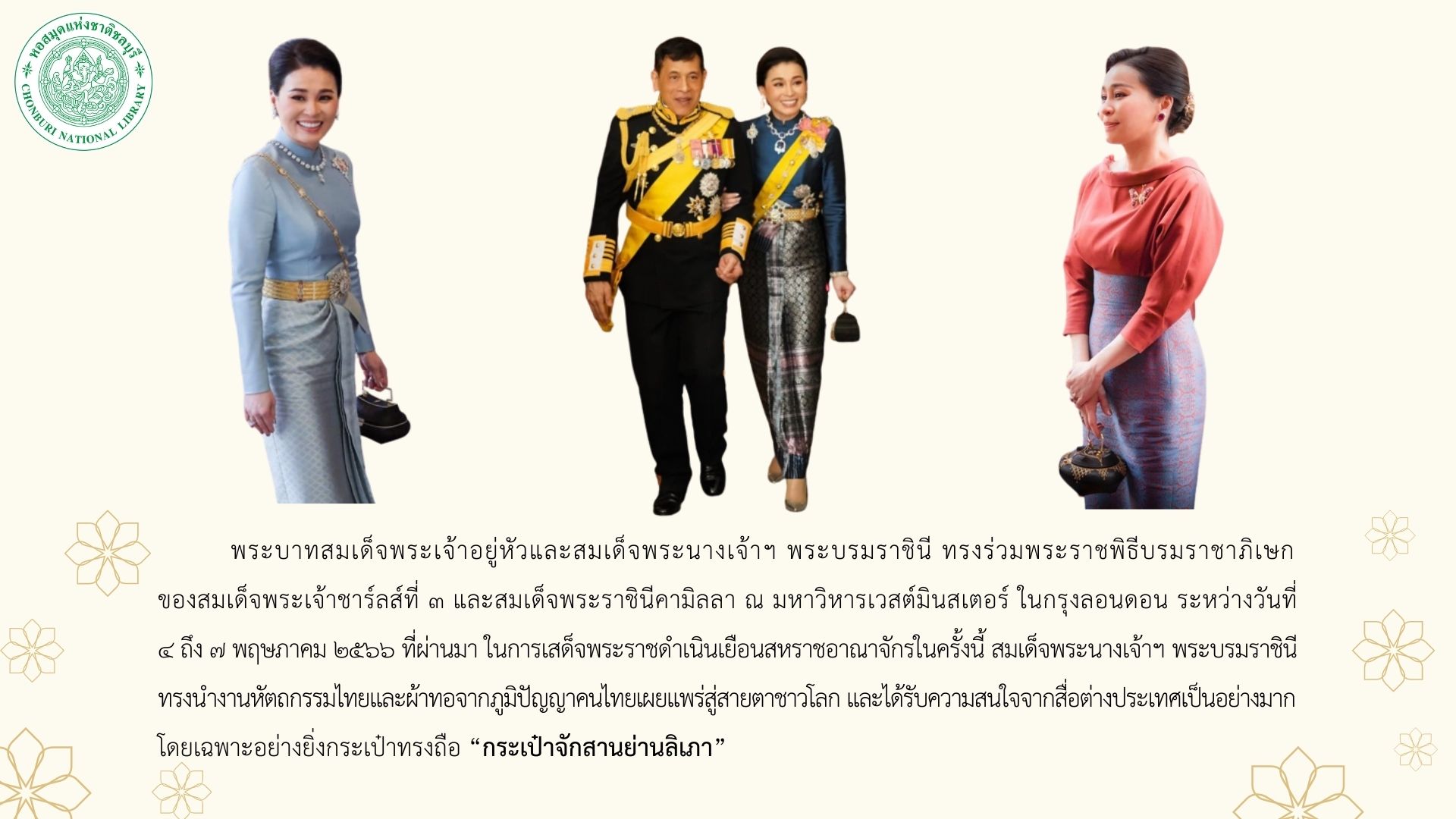 ส่งเสริมการอ่านผ่าน Facebook กับหอสมุดแห่งชาติชลบุรี เนื่องในโอกาสวันเฉลิมพระชนมพรรษาสมเด็จพระนางเจ้าฯ พระบรมราชินี ๓ มิถุนายน ๒๕๖๖ เรื่อง กระเป๋าจักสานย่านลิเภา : สมเด็จพระนางเจ้าฯ พระบรมราชินี ทรงถือในการเสด็จพระราชดำเนินเยือนสหราชอาณาจักร