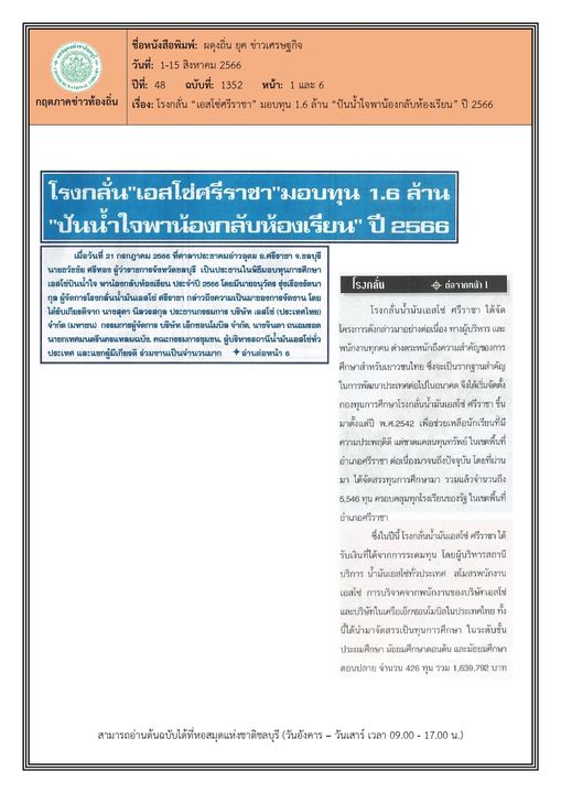 กฤตภาคข่าวท้องถิ่น เรื่อง โรงกลั่น “เอสโซ่ศรีราชา” มอบทุน 1.6 ล้าน “ปันน้ำใจพาน้องกลับห้องเรียน” ปี 2566
