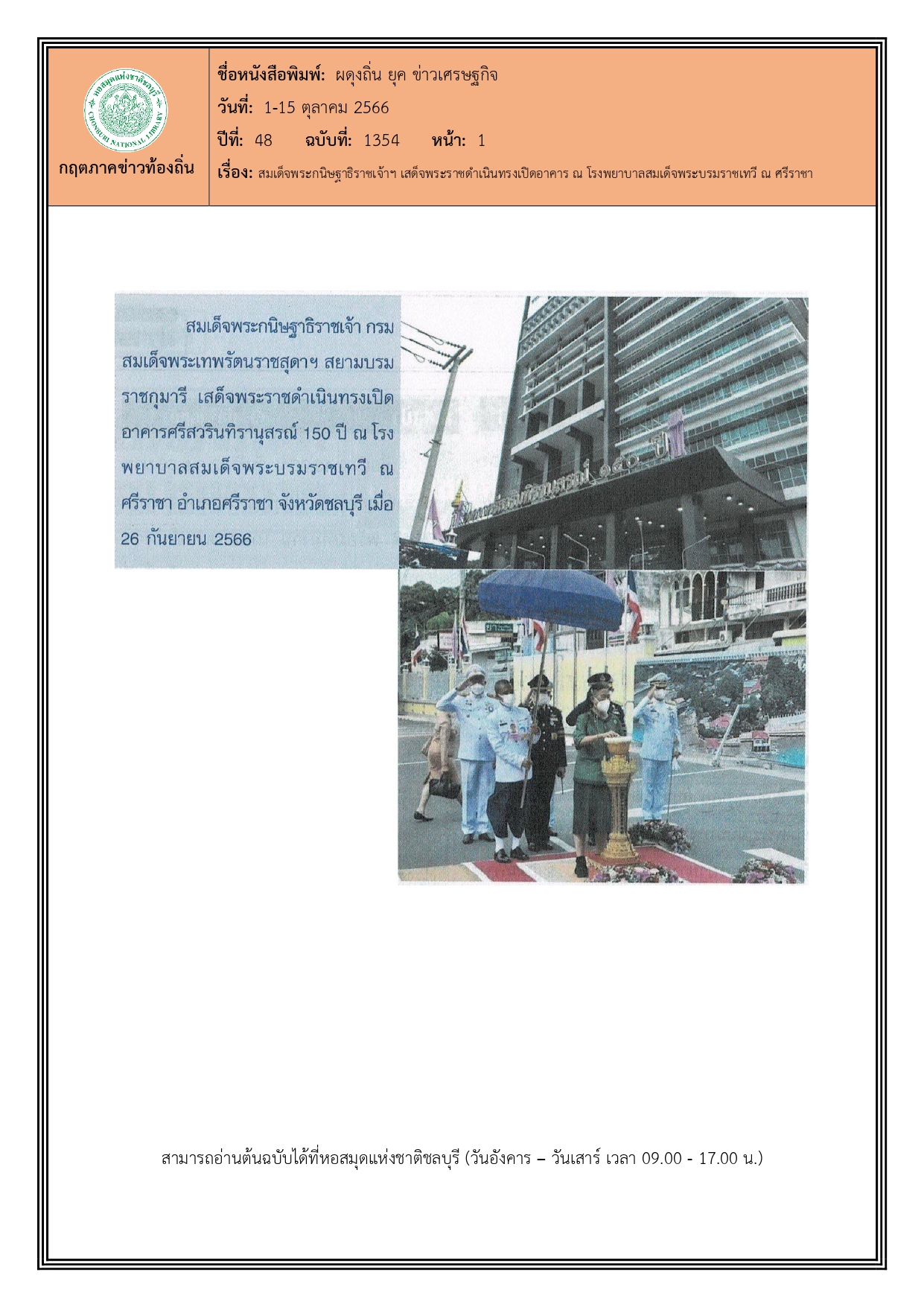 กฤตภาคข่าวท้องถิ่น เรื่อง สมเด็จพระกนิษฐาธิราชเจ้าฯ เสด็จพระราชดำเนินทรงเปิดอาคาร ณ โรงพยาบาลสมเด็จพระบรมราชเทวี ณ ศรีราชา