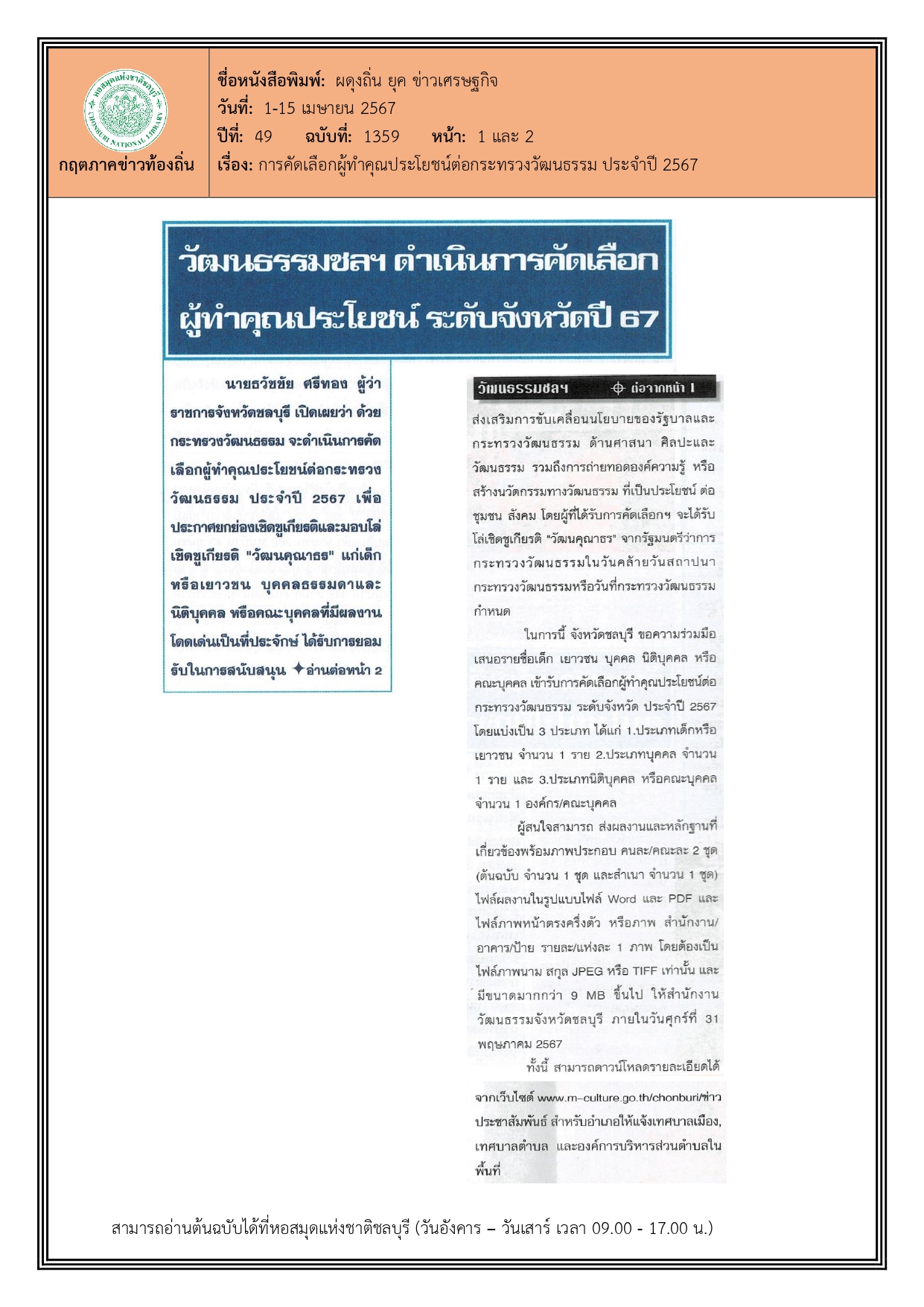 กฤตภาคข่าวท้องถิ่น เรื่อง การคัดเลือกผู้ทำคุณประโยชน์ต่อกระทรวงวัฒนธรรม ประจำปี 2567