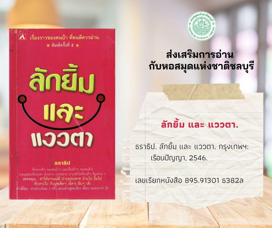 ลักยิ้มและแววตา เล่มนี้ ผู้เขียนพาเราไปพบกับ สารพัดเรื่องราวตามสไตล์การเขียนของ “ธราธิป” เจ้าของนามปากกาที่ถ่ายทอดเรื่องราวได้สะกิดอารมณ์ของผู้อ่านได้เสมอ เป็นเรื่องราวเมื่อครั้งที่ผู้เขียนเรียนจบใหม่ๆ และกำลังหางานทำ แต่ไม่ว่าจะไปสมัครงานหรือสอบบรรจุที่ใดก็ยังไม่ประสบความสำเร็จเสียที จนวันหนึ่งความเครียดและความวิตกกังวลที่รุมเร้าส่งผลให้ร่างกายเกิดอาการผิดปกติบางอย่างขึ้น เช่น ใจสั่น เหงื่อออกมาก และหวาดกลัวว่าจะมีคนมาทำร้าย จนคุณป้าเพื่อนบ้านได้แนะนำให้ไปพบกับจิตแพทย์ผู้มากประสบการณ์ และคุณหมอได้ตรวจวินิจฉัยแล้วว่าเขาเป็นโรคประสาท แรกเริ่มเขาไม่อาจทำใจยอมรับได้แต่เมื่อได้รักษาไปสักระยะหนึ่งก็ถึงเวลาที่ต้องยอมรับความจริง กลุ่มเพื่อนสนิทเมื่อรู้ข่าวก็มาเยี่ยมและช่วยหาวิธีรักษาทั้งทางวิทยาศาสตร์และไสยศาสตร์ จนพากันไปพบเจ้าพ่อร่างทรงด้วยหวังว่าจะช่วยรักษาให้หายได้ และได้ข้อสรุปว่ารักษาด้วยยาของแพทย์จะดีกว่า ผู้เขียนมีความฝันในวัยเด็กว่าอยากจะเป็นนักเขียน เมื่อชีวิตต้องพบกับเหตุการณ์ไม่คาดฝันเช่นนี้จึงเบนเข็มกลับไปทำตามความฝันและดูเหมือนว่าจะไปได้ดีเสียด้วย เมื่อเขาได้เข้าทำงานในกองบรรณาธิการนิตยสารทอน การได้ทำงานประจำครั้งนี้มีเรื่องราวทั้งดีและไม่ดี ได้พบกับความรักแม้สุดท้ายต้องผิดหวังก็ตาม หนังสือเล่มนี้มีคำเชิญชวนให้อ่านด้วยประโยคที่ว่า “เรื่องราวของคนบ้าที่คนดีควรอ่าน” เพราะเราจะได้อ่านไปยิ้มไปกับมุขตลกตามประสาของความประสาทและสร้างความประหลาดใจ ผู้สนใจสามารถหาอ่านได้ที่หอสมุดแห่งชาติชลบุรี (วันอังคาร – วันเสาร์ เวลา 09.00 - 17.00 น.)