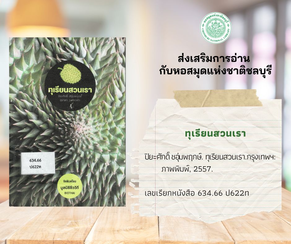 ทุเรียนสวนเรา เล่มนี้ ผู้เขียนพาเราไปพบกับ เรื่องราวของทุเรียนที่เปรียบเสมือนอัญมณีชิ้นงามแห่งการเกษตร จนได้รับการกล่าวขานว่าเป็นราชาแห่งผลไม้ เหตุเพราะทุเรียนมีเอกลักษณ์เฉพาะตัว ภายนอกมีแต่หนามแหลมคมแต่ห่อหุ้มไว้ซึ่งเนื้อในสีเหลืองละมุนที่มาพร้อมกับรสชาติหวานมันกลมกล่อมแบบไม่ซ้ำใคร เมื่อได้ทานแล้วก็อยากทานอีกคล้ายกับการเสพติดเลยทีเดียว ทุเรียนเป็นผลไม้เขตร้อน สามารถเพาะปลูกได้ดีในภูมิภาคเอเชียตะวันออกฉียงใต้ สันนิษฐานว่ามีถิ่นกำเนิดอยู่ที่เกาะบอร์เนียว เกาะสุมาตรา และคาบสมุทรมลายู สำหรับประเทศไทยพบว่ามีการปลูกทุเรียนในช่วงรัชสมัยของสมเด็จพระนารายณ์มหาราช อ้างอิงจากบันทึกจดหมายเหตุรายวันของบาทหลวงชาวฝรั่งเศสที่เดินทางมาเจริญสัมพันธไมตรีกับกรุงศรีอยุธยา เมื่อปี พ.ศ. 2228 – 2229 โดยต้นกำเนิดของทุเรียนไทยมาจาก 5 สายพันธุ์ดั้งเดิม ได้แก่ ลวง การะเกด ทองสุก ทองย้อยเดิม และกำปั่น จากนั้นเกิดการผสมข้ามสายพันธุ์จนกลายเป็นทุเรียนพันธุ์ดีตามมาอีกมากมาย ดังที่เรารู้จักกันในปัจจุบัน เช่น ชะนี ก้านยาว และหมอนทอง เนื้อในของผลไม้ที่มีหนามแหลมชนิดนี้อุดมไปด้วยคุณค่าทางอาหารในแง่พลังงานซึ่งมีมากกว่าผลไม้ชนิดอื่น และหลายท่านยังคงมีความกังวลว่าการทานทุเรียนจะทำให้ร่างกายได้รับไขมันและคอลเรสเตอรอลมากเกินไปหรือไม่ ผลการวิเคราะห์ทางเคมี พบว่า ทุเรียนเป็นผลไม้ที่ปราศจากคอลเรสเตอรอลอย่างสิ้นเชิง เพราะในเนื้อทุเรียนไม่มีองค์ประกอบของไขมันอิ่มตัว แต่อย่างไรก็ตามควรบริโภคในปริมาณที่เหมาะสม ทุเรียนสวนเรายังอธิบายถึงขั้นตอนการปลูกและการดูแลรักษา ลักษณะทางกายภาพของทุเรียน แนะนำสายพันธุ์ต่างๆ ที่เราอาจจะไม่คุ้นเคยมากนัก ส่งท้ายด้วยเมนูแสนอร่อยที่ทำมาจากทุเรียน ผู้สนใจสามารถหาอ่านได้ที่หอสมุดแห่งชาติชลบุรี (วันอังคาร – วันเสาร์ เวลา 09.00 - 17.00 น.)