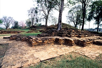 การสํารวจทางโบราณคดีที่ผ่านมาได้พบหลักฐานแหล่งโบราณคดี สมัยทวารวดีประมาณ ๑๐๖ แหล่ง ราว ๗๐ แหล่ง อยู่ในเขตที่ราบลุ่ม ภาคกลางตามลําน้ําเจ้าพระยา และภาคตะวันออก ส่วนที่เหลือ อยู่ในภาค อีสานประมาณ ๓๐ แหล่ง นอกเหนือจากนั้นอยู่ในเขตภาคเหนือ ๒ - ๓ แหล่ง ส่วนใหญ่ตั้งอยู่บริเวณที่ราบลุ่มใกล้ลําน้ําสําคัญ สามารถติดต่อกับ ชุมชนอื่นได้สะดวก โดยเริ่มจากบริเวณเมืองท่าใกล้ชายฝั่งทะเล หรือตาม เส้นทางการค้าในสมัยโบราณ ผังของเมืองโบราณ เมืองโบราณในสมัยทวารวดีมีแผนผังไม่เป็นรูปทรงเรขาคณิต มีทั้งที่ เป็นรูปวงกลม วงรี และเกือบเป็นสี่เหลี่ยมผืนผ้า ขึ้นอยู่กับภูมิประเทศ ตัว เมืองด้านหนึ่งมักตั้งอยู่ติดกับลําน้ํา มีคูน้ําและคันดินล้อมรอบ โดยทั่วไป มีเพียงชั้นเดียว อาจใช้ประโยชน์เพื่อการป้องกันอุทกภัย การสาธารณูปโภค หรือการป้องกันศัตรู ไม่พบหลักฐานสิ่งก่อสร้างที่เป็นที่อยู่อาศัย ส่วนใหญ่ เป็นฐานเจดีย์ หรืออาคารขนาดเล็กก่อด้วยอิฐ ทั้งภายในและนอกเขตกําแพง เมือง แสดงให้เห็นว่าชุมชนโบราณนั้นอยู่กระจายกันออกไปมิได้อยู่อาศัย เฉพาะภายในเขตกําแพงเมือง สถาปัตยกรรมสมัยทวารวดี สถาปัตยกรรมในสมัยทวารวดี ล้วนแล้วแต่เป็นศาสนสถานทั้งสิ้น อาจ จําแนกได้ ออกเป็น ๒ ประเภท คือ ศาสนสถานที่อยู่ในถ้ํา และศาสนสถาน กลางแจ้ง ศาสนสถานที่อยู่ในถ้ํา การใช้ถ้ําเป็นศาสนสถานน่าจะเกิดจากความ ต้องการใช้พื้นที่ธรรมชาติประกอบพิธีกรรมทางศาสนา ด้วยการสร้าง ประติมากรรมรูปเคารพไว้ภายใน หรือสลักเป็นภาพนูนต่ําไว้บนผนังถ้ํา ก็ ถือว่าเป็นศาสนสถานได้ หรืออาจได้รับคติสืบทอดมาจากกลุ่มชนสมัยก่อน ประวัติศาสตร์ตอนปลายที่ใช้ถ้ําสําหรับประกอบพิธีกรรม หรือได้รับอิทธิพล มาจากการใช้ถ้ําเป็นศาสนสถานของอินเดียที่เรียกว่า “เจติยสถาน” เป็น ถ้ําที่เจาะเข้าไปโดยฝีมือมนุษย์ ตั้งแต่สมัยอินเดียโบราณ ราวพุทธศตวรรษ ที่ ๓ - ๖ และเป็นที่รู้จักกันโดยทั่วไปในสมัยคุปตะ เช่น ถ้ําอชันตา ถ้ํา เอลโลรา เป็นต้น ศาสนสถานที่อยู่ในถ้ําสมัยทวารวดีในภาคกลางมีอยู่หลาย แห่งด้วยกัน อาทิ ถ้ําฤาษี เขางู จังหวัดราชบุรี ถ้ําพระโพธิสัตว์ จังหวัดสระบุรี ถ้ําเขาถมอรัตน์ จังหวัดเพชรบูรณ์ และถ้ําคูหาสวรรค์ จังหวัดสุราษฎร์ธานี ในภาคใต้ เป็นต้น ศาสนสถานกลางแจ้ง คือสถาปัตยกรรมที่พบอยู่โดยทั่วไป ทุกเมือง โบราณในสมัยทวารวดี ส่วนใหญ่สร้างขึ้นเนื่องในศาสนาพุทธ เหลือเพียง ส่วนฐานเท่านั้น อาจเป็นส่วนฐานของสถูปหรือเจดีย์ ส่วนใหญ่มีแผนผังรูป สี่เหลี่ยมจัตุรัส และสี่เหล
